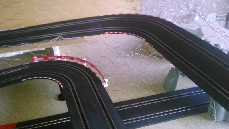 Je vois que plusieurs sections de ta piste reposent encore uniquement sur les pieds plastiques du fabricant ( Je les utilise aussi actuellement sur ma piste provisoire, et je ne les trouve pas terriblement stables ... ).