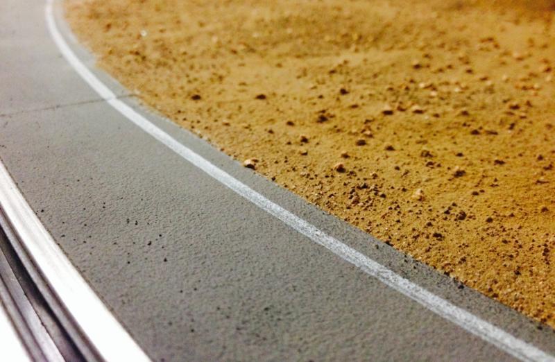 J'ai commencé à intégrer la piste et ses accotements. J'ai fait disparaître ces vilains "vibreurs" rouge et blanc. Va falloir attaquer la peinture de la piste, mais je ne me suis pas encore arrêté sur le type de peinture. J'ai des hésitations. En plus, il commence à faire un peu froid pour attaquer ce genre de choses, ça risque de mettre longtemps à sécher. Donc ce sera pour la fin de l'hiver.