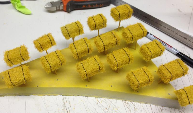 et en passant ... je viens de terminer une cinquantaine de bottes de paille ... grrrrr qu'est-ce que c'est chiant quand on veut que ça ait de l'allure ^^Je spray un léger voile de noir mat depuis très loin pour leur donner un peu de vécu avant de les poser. Là elles sont justes "terminée" comme neuves.