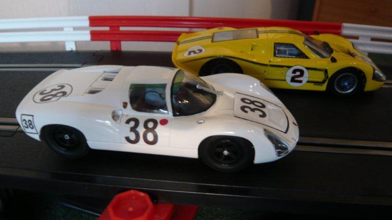 J'ai donc acheté une petite soeur : la Porsche 910 en "Kit carrosserie complète" avec un châssis identique à celui de la Ford et des inserts de roues. Le reste est venu de mes réserves : roues, pneus, moteur slim.17rpm, axe, pignonnerie etc... peinture et apprêt blancs bricotruc et Klir... décalcos entièrement faites maison (y compris logos Porsche) avec imprimante jet d'encre.
