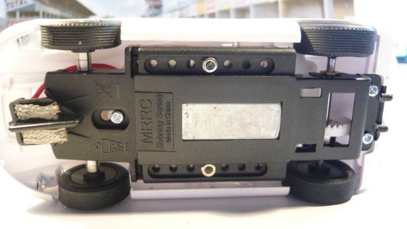Contrairement aux modèles "Clubman" avec châssis en métal, on trouve ici le châssis plastique "sebring" MRRC qui est bien fait et permet les réglages de base. Il possède deux emplacements avant-arrière pour aimants ou lest de même dimension que l'on trouve dans leurs pièces détachées. Il existe aussi des lests latéraux qui s'imbriquent dans le châssis.