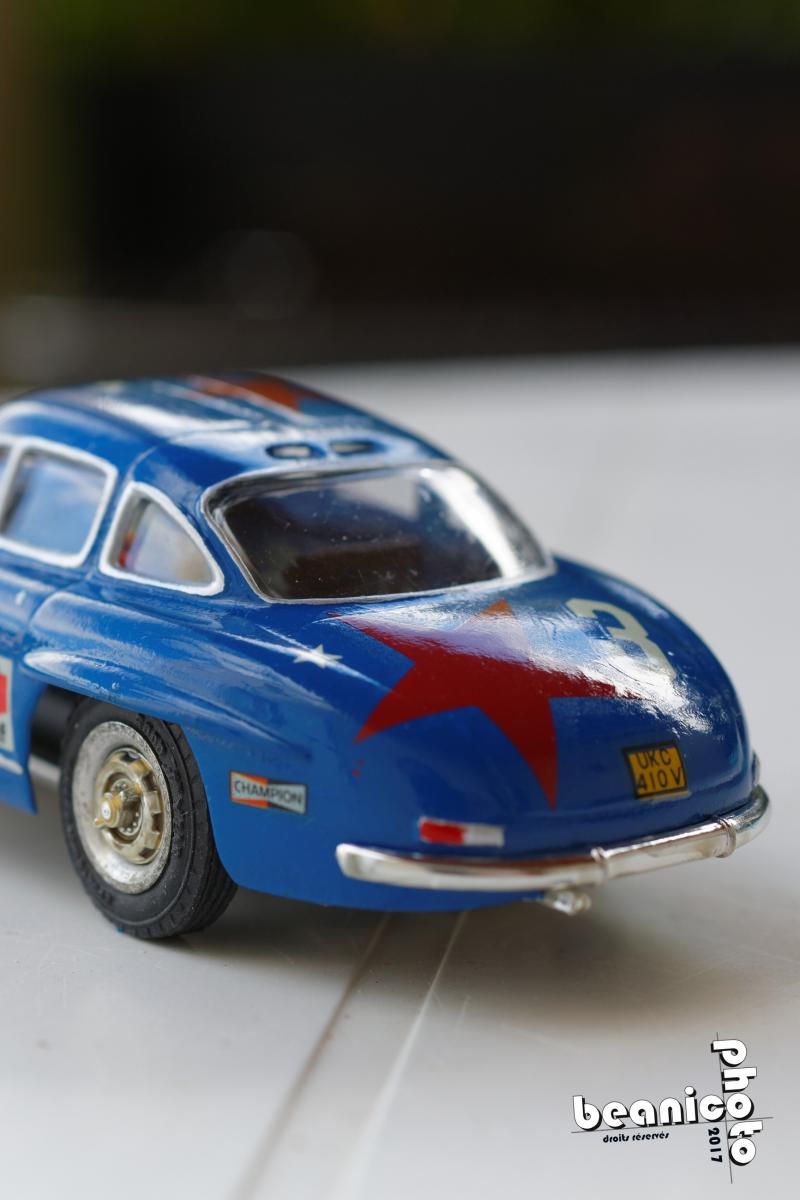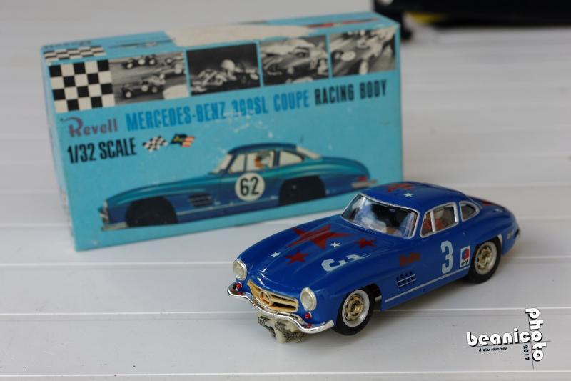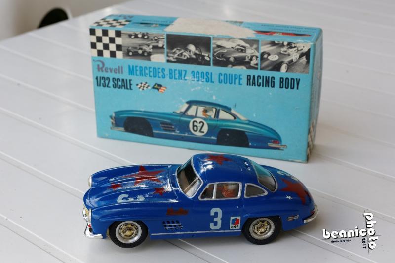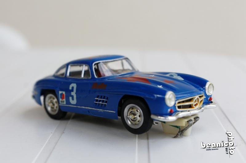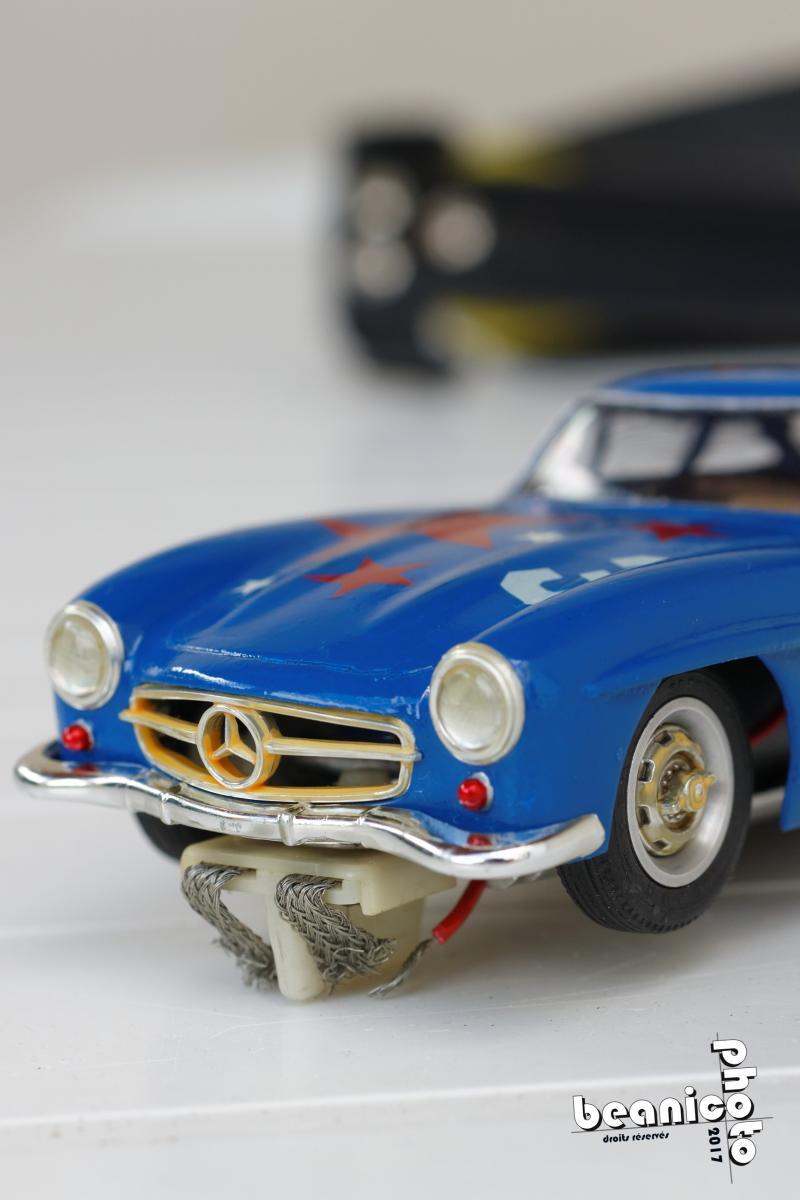Comme on peut le voir sur les photos, les pièces chromées ont un peu perdu de leur brillant d'origine, j'ai choisi de les laisser dans l'état, dans un esprit de respect de l'âge du kit. Un choix de collectionneur, pas forcément de puriste de la reproduction. En tout cas, je suis très content d'avoir réalisé cette Mercedes, car dans le monde du slot, la 300SL n'existe que très peu... Je ne sais pas pourquoi cette voiture mythique a si peu été choisie comme voiture de slot par les fabricants... C'est une des raisons d'origine de mes acquisitions de ces kits Revell ! Je l'avais trouvée pour pas trop cher il y quelques années, si cela devait être aujourd'hui, je trouve que les prix pour un kit propre (voire neuf comme le mien) est assez prohibitif !