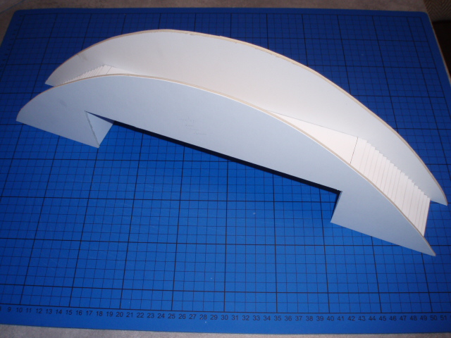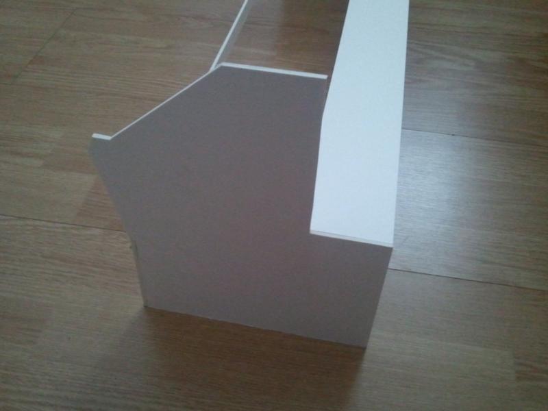 La photo suivante ne correspond qu'à la moitié de la longueur totale. Je suis en train de couper les renforts (qui vont constituer chaque stand). Pour le toit, quelque chose un peu comme Sergio a fait avec du carton ondulé. Pour l'arrière, j'ai trouvé de petits tubes en alu chez Brico d...., et ça devrait pas mal rendre. Le tout est cette fois-ci réalisé en carton bois (carton pour l'encadrement).