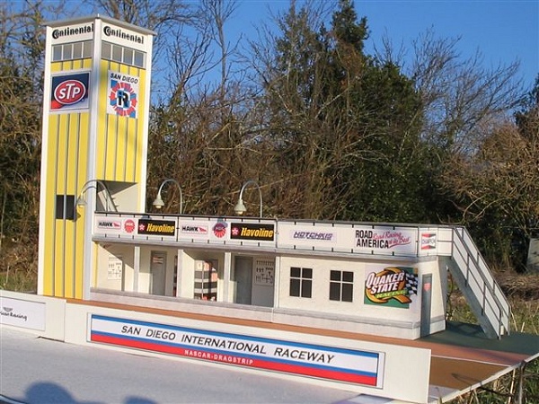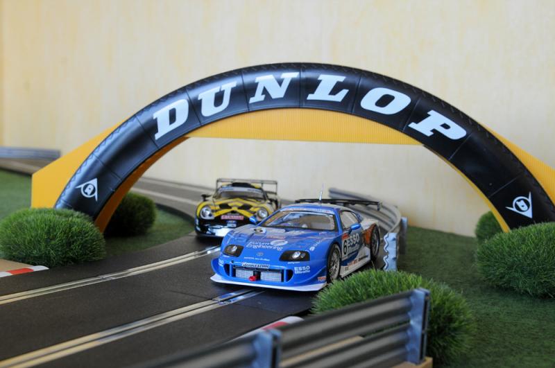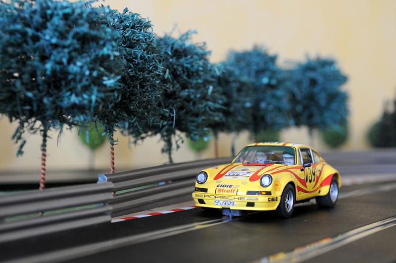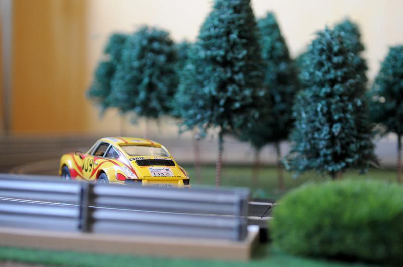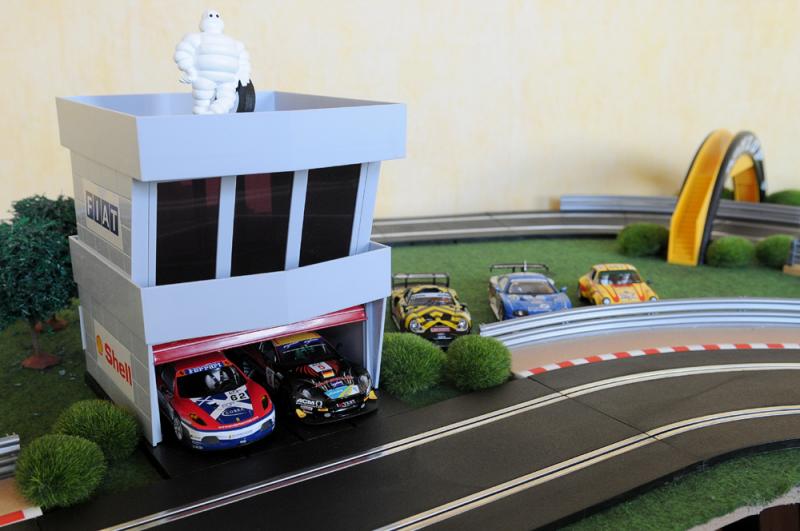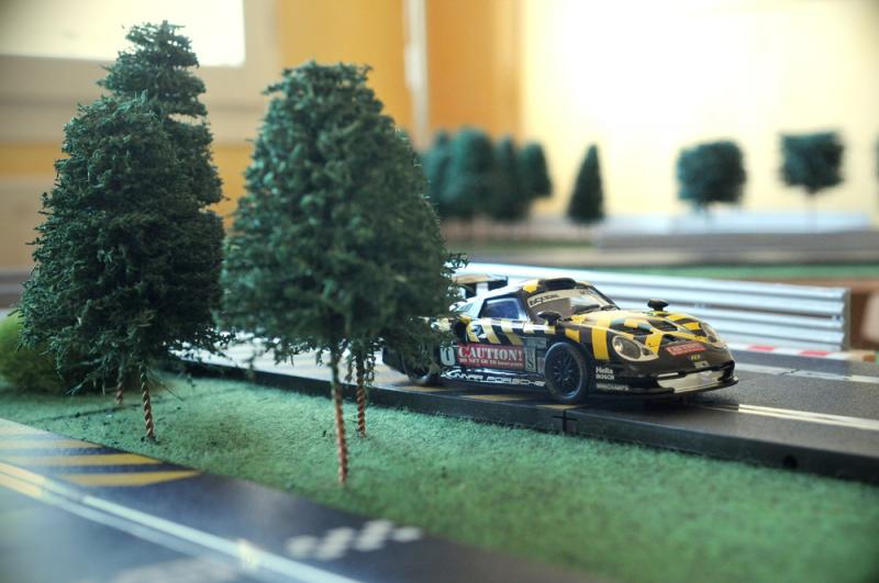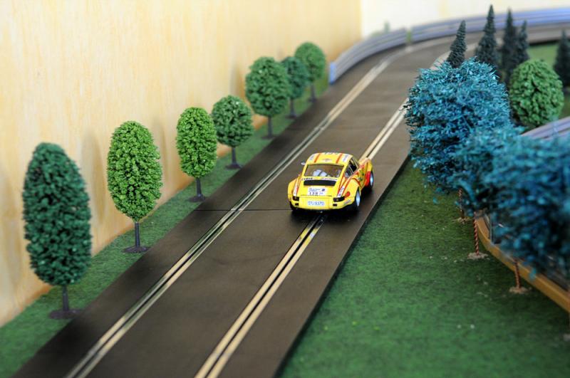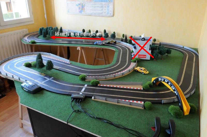 Et voilà quelques photos de ma piste après son installation. C'est vrai qu'après quelques arbres, un bâtiment et autres décors, c'est déjà plus sympa. Pour les arbres, je me tourne vers la fabrication maison suivant la méthode demether. Bon, je cogite encore à savoir comment je vais faire tronc, mais le rendu final me convient, et convient aussi très bien à mon porte monnaie..... Je dois encore en faire un bonne 40aine pour avoir le rendu que je veux, mais ça il va falloir trouver le temps. Sinon, ce matin j'ai surélevé le virage à 90 au fond à gauche, car les voitures avaient tendance à sortir, et, vu le manque de place à aller dans le mur. Comme je tiens à mes autos, ça évite les sorties, et après installation, je trouve le rendu visuel pas mal.