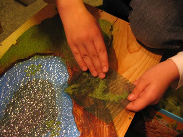On a pris une plaque de carton-plume découpée à la forme de l'emplacement désiré, puis tracé et découpage de la forme du "lac", une impression de peinture marron puis sur une feuille Nitro a réalisé la peinture de l'eau et nous avons appliqué dessus une plaque déjà prête "eau" (pour l'instant on ne s'est pas lancé dans la résine liquide).