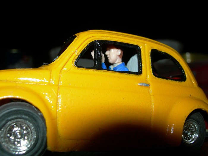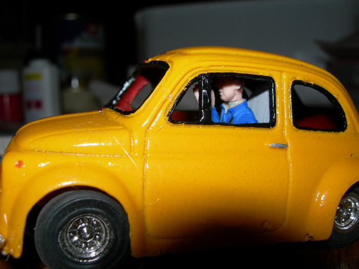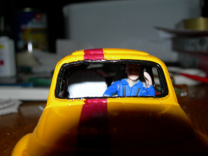 bon, j'ai peint l'interieur en rouge comme la bande sur la voiture, mis 2 fauteuilles et un conducteur, j'me suis fait caguer a faire un tableau de bord et on le vois même pas !!!!!!
