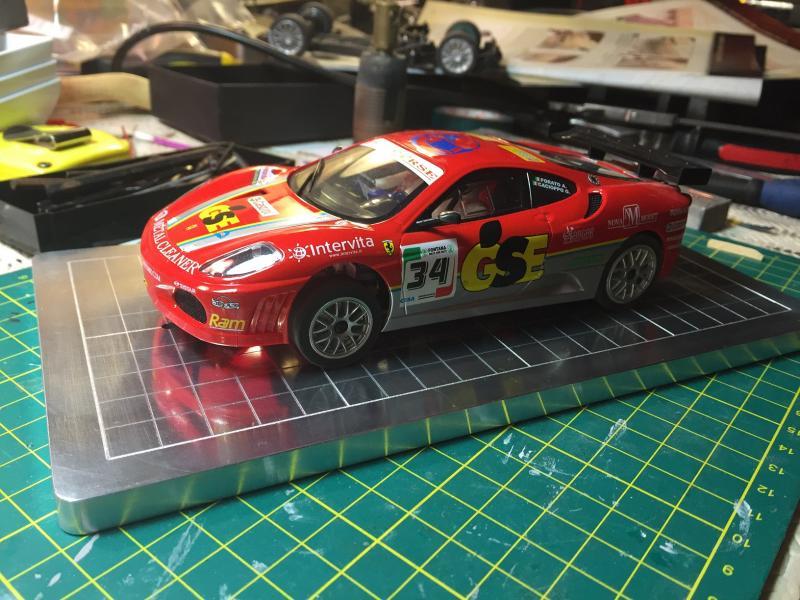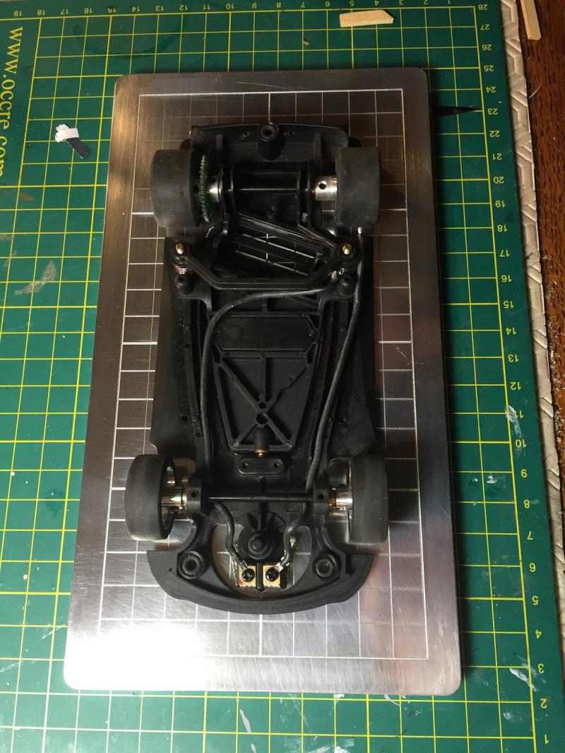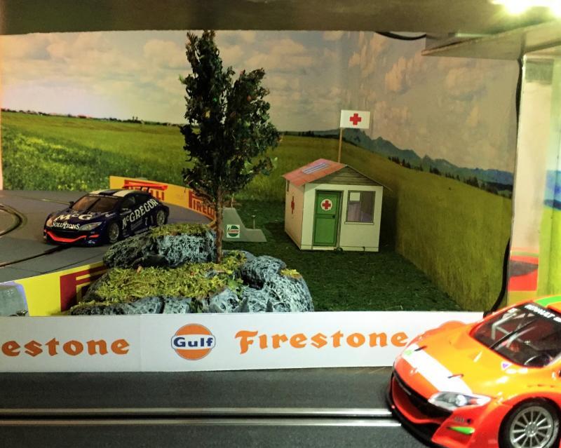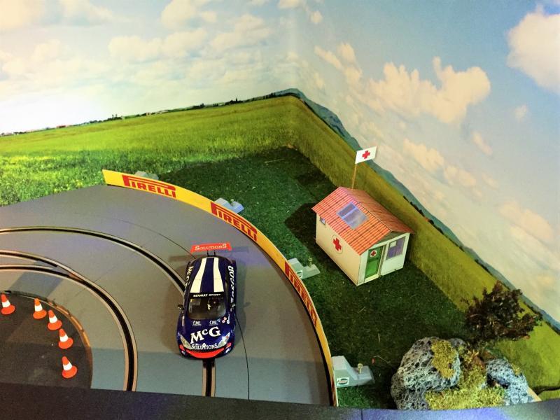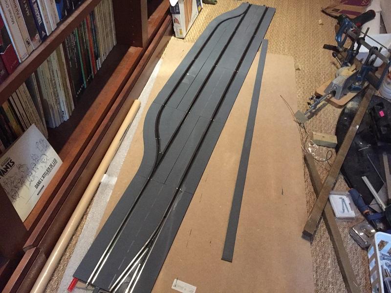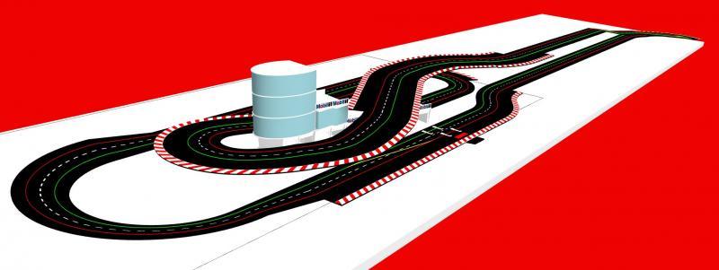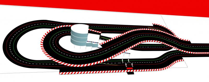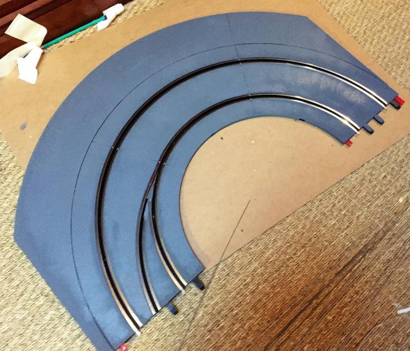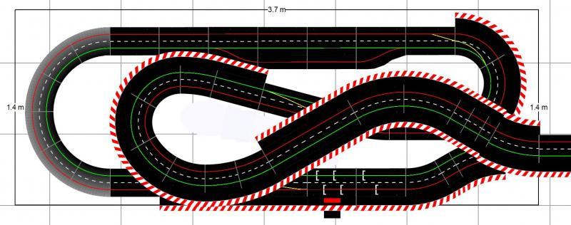 Je me remets à la construction. Cela faisait un moment que j'y pensais et bien voilà! Pour régler différents problèmes qui ont vu le jour au fur et à mesure. Le premier est l'équilibre des pistes. Au début, on ne voyait pas la différence avec mon fils, mais maintenant avec notre meilleur maîtrise du Slot, cette différence est trop importante. Ensuite nous faisons régulièrement du 1/24, il faut donc des bordures sur tous les virages et les lignes droites en prolongement. Voilà donc un premier essai, vous constaterez que c'est très proche de la solution de pp+ que je n'avais pas retenu au début.