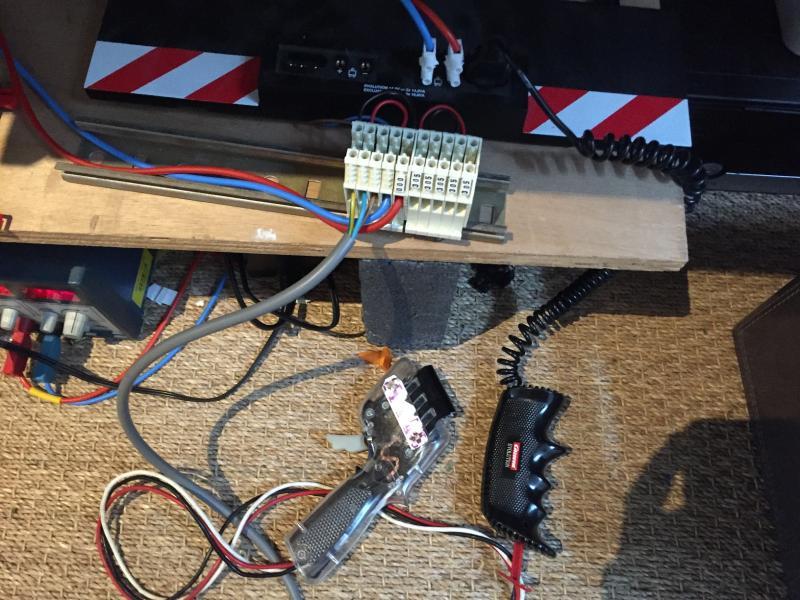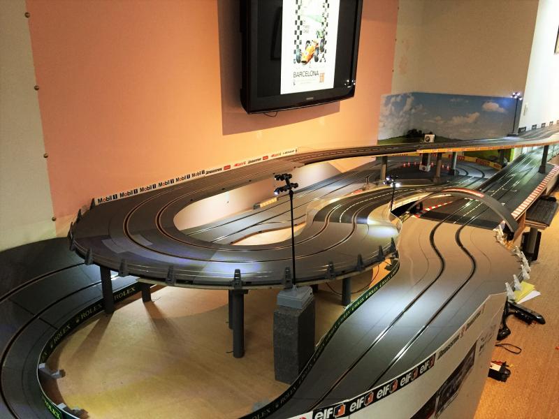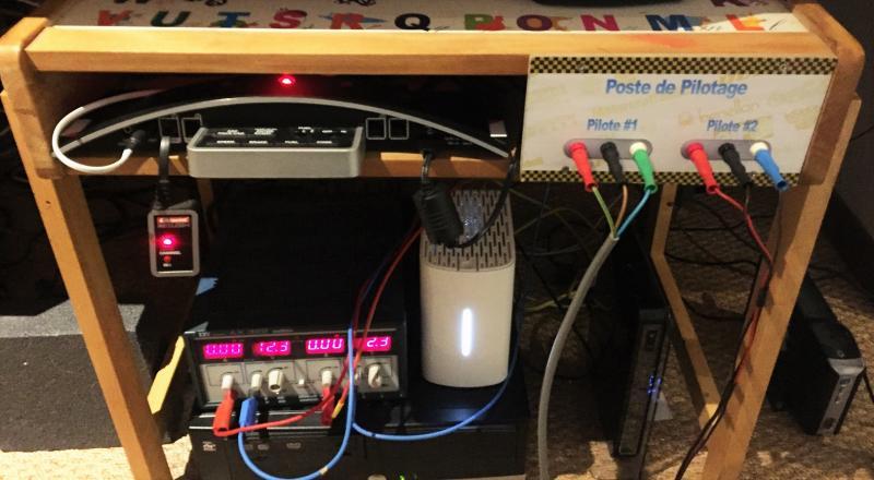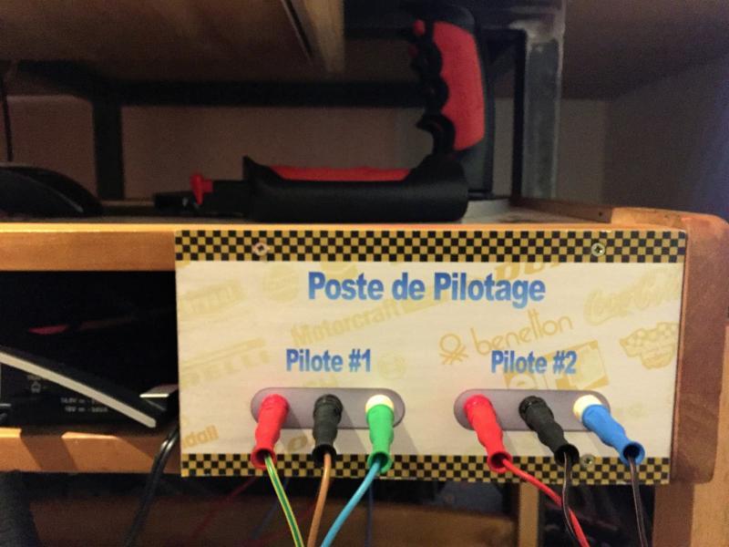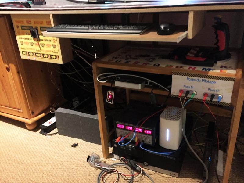 Pas encore fini la peinture de la piste, pas le courage... Mais comme j'ai enfin une poignée (autre que carrera j'entends), je me suis remis à l'électricité, simple mais pratique avec de la récup. J'ai enlevé la base du carrera analogique pour la remplacer par un bête bornier et un semblant poste de pilotage avec un ancien pupitre de mon fils. J'ai aussi installé un plateau rétractable pour clavier et souris. En revanche je vais devoir maintenant jouer de la goulotte pour cacher tous les fils.