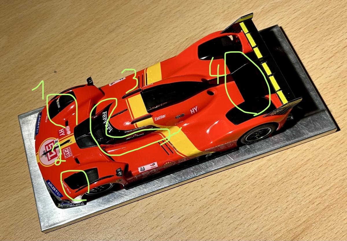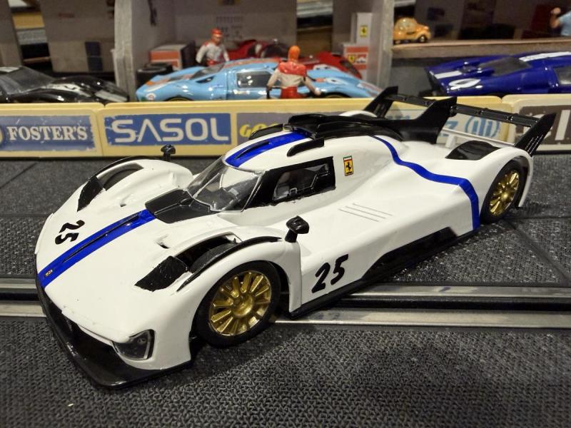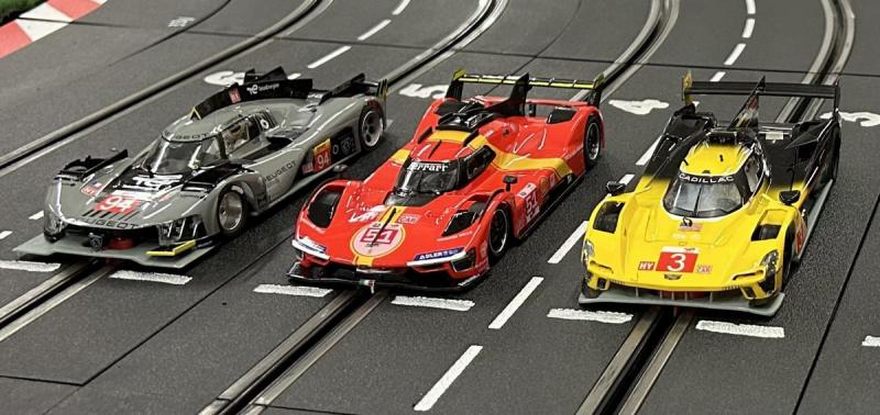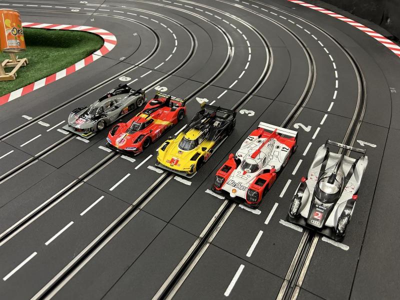 J'étais opposé à deux Hypercars Scaleauto, à savoir une Peugeot et une Cadillac, et à deux LMP, une Toyota SRC et une Audi R18 Slot.It. Ma NSR était mise en piste en état sortie de boîte, les deux Scaleauto étaient proches de la sortie de boîte, tandis que les LMP étaient beaucoup plus préparées: la Toyota de christophes est en configuration course pour le club Slot 4000, tandis que l'Audi R18 de Warson2020 est dans ce que j'appelle une version préparée en pharmacie avec entre autres un produit secret qui améliore l'adhérence des pneus.