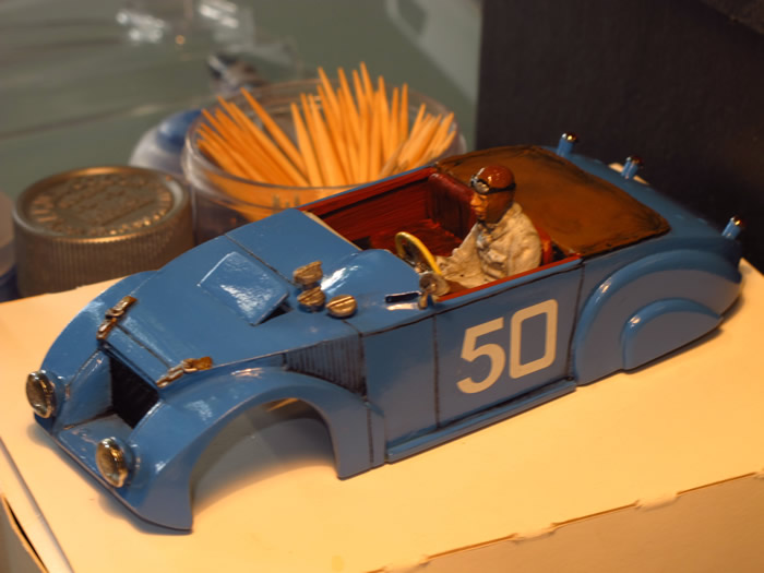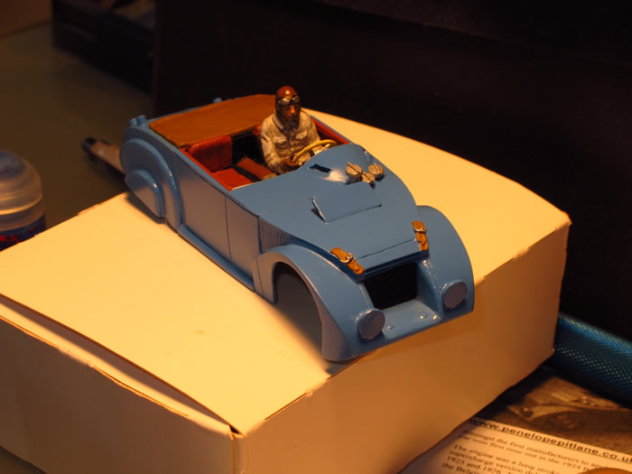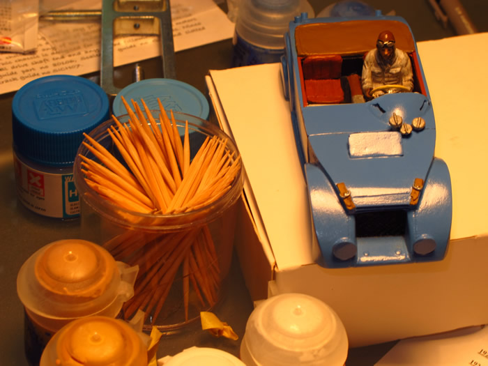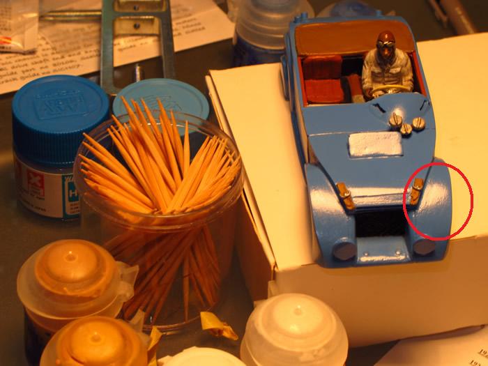 La voiture est plus flatteuse en réalité que sur la photo. J'ai accentué avec un jus à l'huile les jointures de cette carrosserie assez grossière, et patiné le couvre tonneau, enfin, j'expérimente