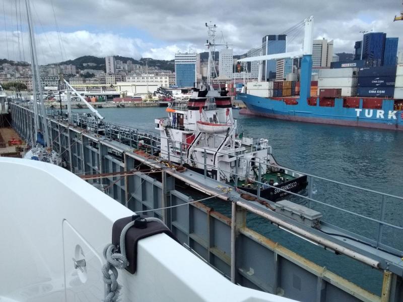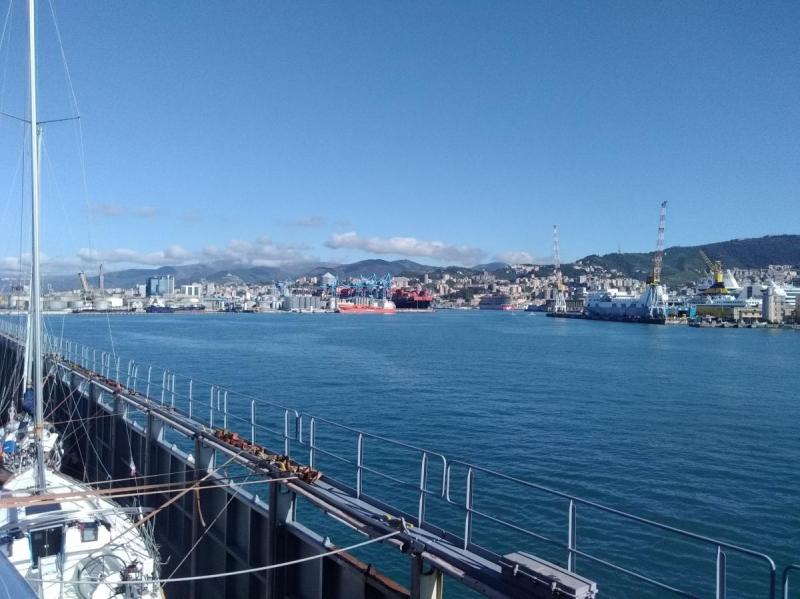 Gène notre destination n'est pas exactement un port de plaisance ni même l'image de carte postale que l'on se fait de l'Italie. C'est un port de commerce au pied d'une ville aux allures industrielle. Une sorte de St Etienne au bord de la mer. Si déprimante qu'ici, même les ponts sont effondrés. Il nous faudra attendre demain matin pour enfin être remis à l'eau et quitter les cales du S.S.4. Aujourd'hui une barge est venue se mettre à couple du cargo pour vidanger ses cuves et évacuer ses poubelles, en accord avec les lois Mar-Pol, qui régissent désormais le trafic maritime pour limiter son impact sur la nature. Là encore c'est juste histoire de se donner bonne conscience. Comme je l'ai expliqué au début de ce journal, le S.S.4 s'aliment au fioul lourd. Un carburant des centaines de fois plus polluant que le sans plomb. Il est démontré que quatre-vingts gros porte-containers, polluent autant que tout le parc automobile français, voitures, camions, autobus, engins de chantiers, agricoles et militaires compris. Rien qu'en une journée, lorsque nous avons traversé Gibraltar, nous en avons croisé une trentaine. Dès lors il est évident que les lois du commerce international, sont supérieures à toute autre prérogative et que les histoires de vignette verte, voitures électriques et autres utopies dans le genre, sont de la poudre aux yeux pour les pauvres naïfs que nous sommes. D'ailleurs le réchauffement de la planète n'est même pas la plus terrible des échéances aux quelles l'humanité va devoir faire face d'ici une génération ou deux. Le vrai problème c'est la surpopulation, mais personne n'en parle parce qu'il n'y a pas de remède acceptable contre cette plaie qui menace l'avenir de notre espèce.