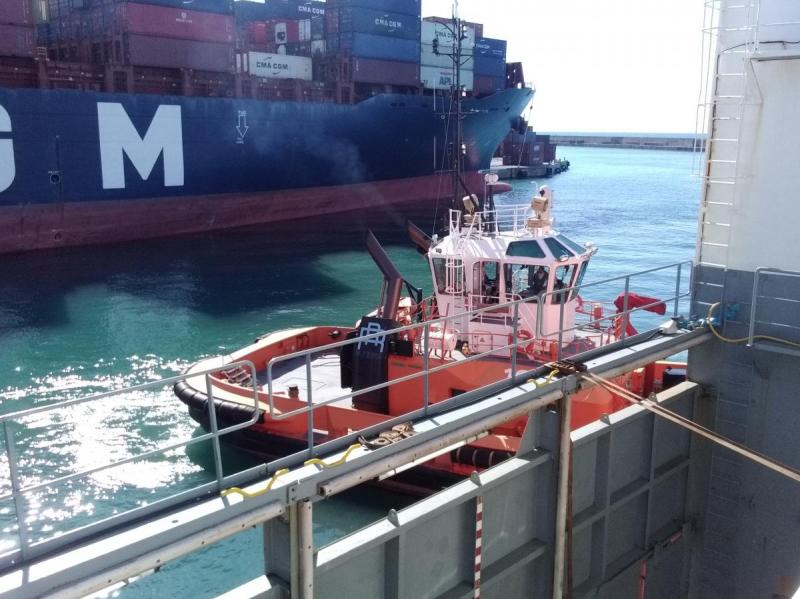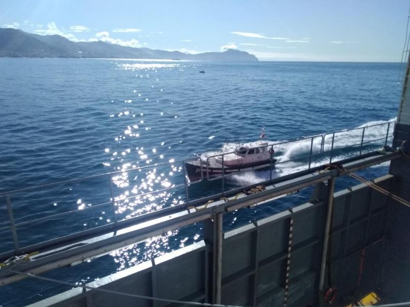 Ici l'arrivée du Bateau Pilote. Ce dernier va monter à bord pour guider notre commandant vers son poste d'amarrage.