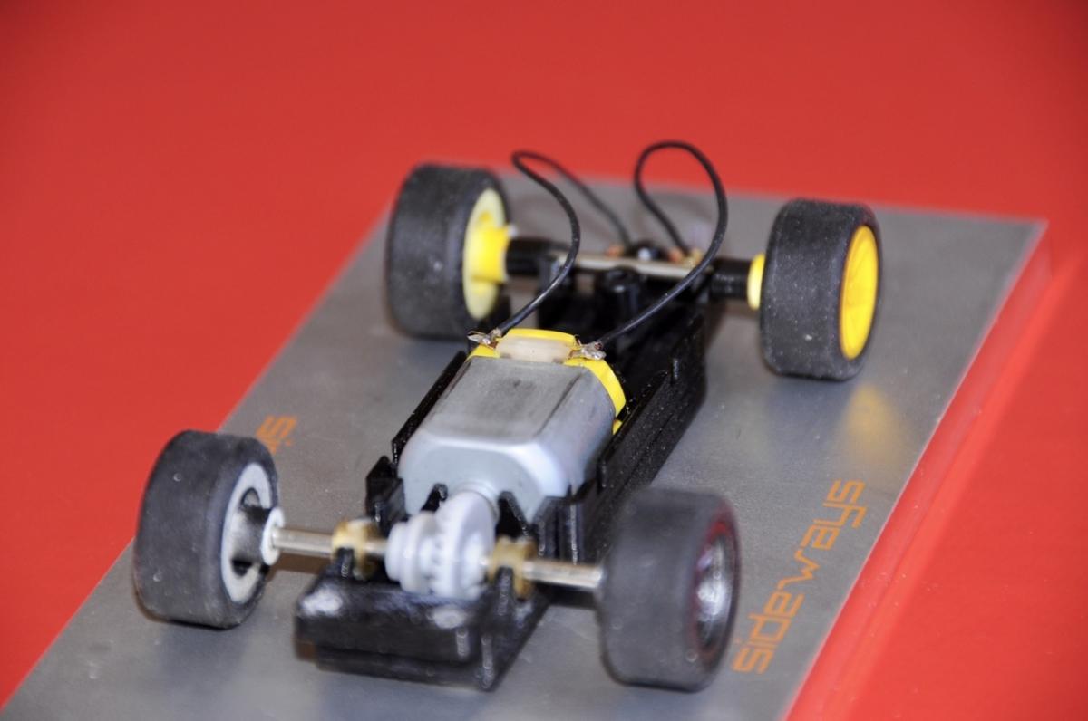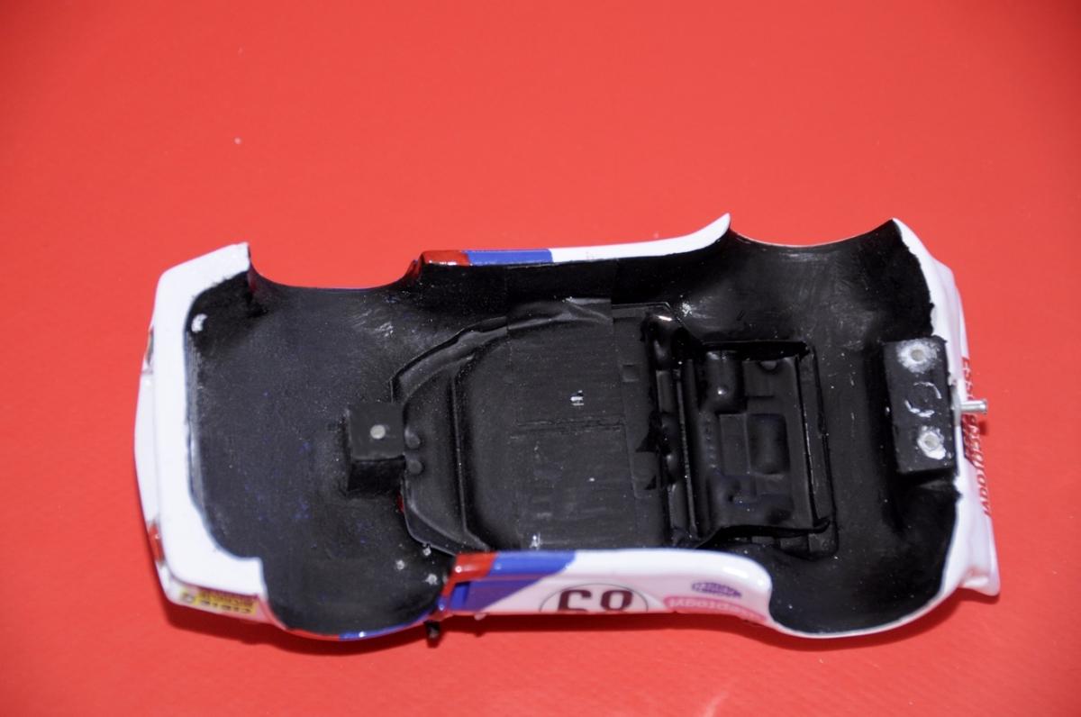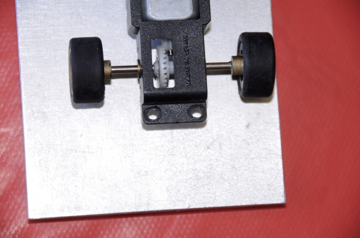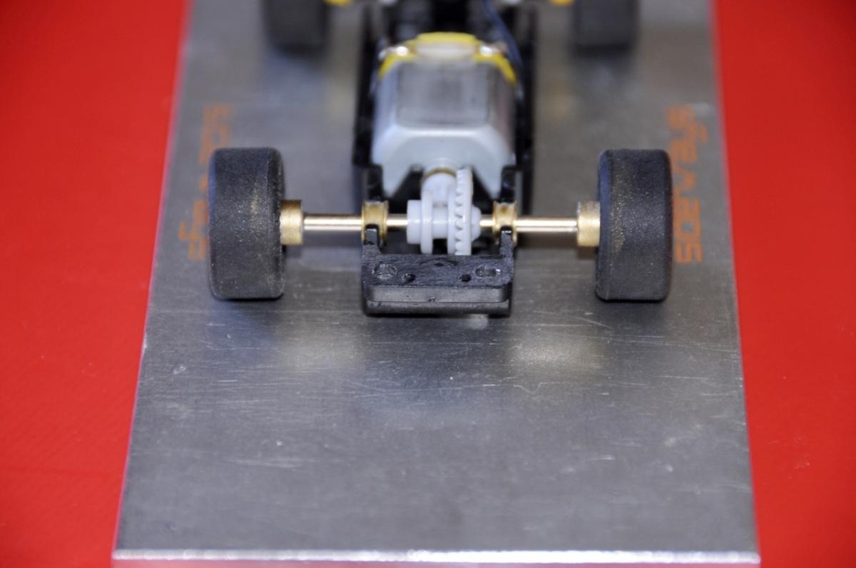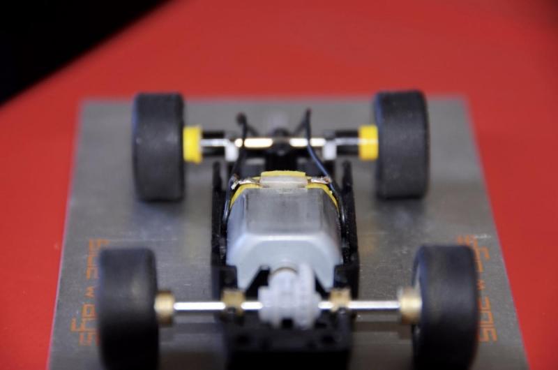 Les châssis utilisés sur ces deux voitures sont des Slot Classic. Le problème avec ces châssis est que les moteurs type Mabuchi standards (Scalextric, Fly, NSR, Slot.it…) doivent être montés avec le collecteur à l'avant, c'est-à-dire que les cosses de contact sont vers l'avant. Du coup, le cockpit limite généralement l'abaissement de la carrosserie et, effectivement, sur ces deux modèles, c'était bien les cosses du moteur qui touchaient l'habitacle.