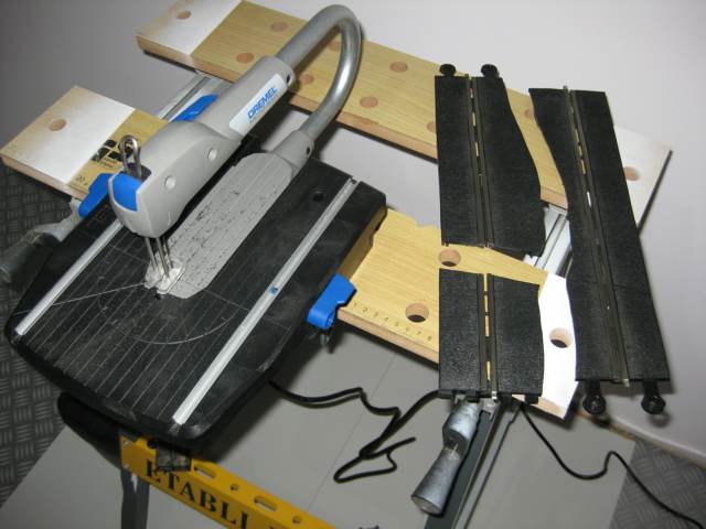 Et j'ai installé mon atelier pour les découpes. J'ai pu faire un test en massacrant un premier rail PT60. Y'a pas, la Dremel Motosaw est le bon outil. Le trois voies est donc en bonne voie.