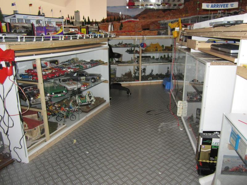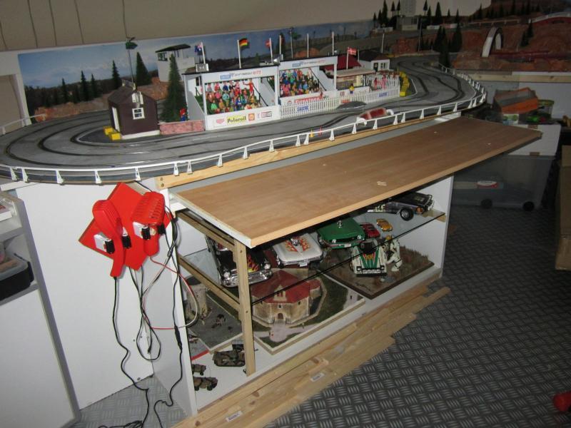 Cela faisait quelques semaines que je n'avais pas fait grand chose sur le circuit lui-même. Mais ça y est, j'ai commencé l'aménagement du dessous du circuit en vitrine d'exposition pour mes nombreux modèles statiques (j'en fait depuis presque 40 ans ! et heureusement que je n'ai pas tout gardé...).