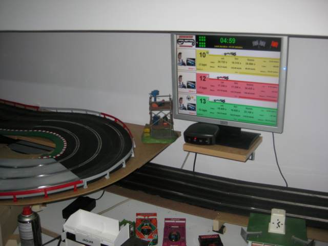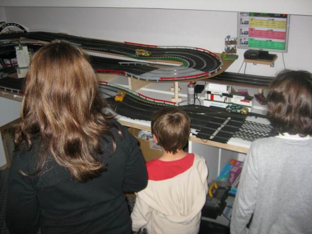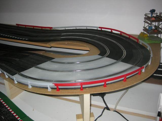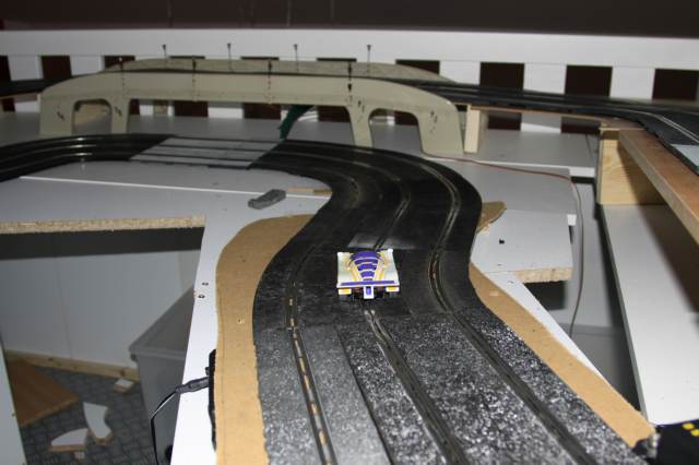 J'ai réussi à finir toutes les connexions dans l'après midi... Ainsi le circuit est bouclé et ne bouge plus. Les trous entre les rails ont disparu. Bref, un plaisir à rouler... Alors je me suis fait plaisir, j'ai sorti une powersledge (la Panther) qui après quelques tours de chauffe (ces moteurs ont besoin de chauffer !) a donné sa pleine mesure. J'ai remarqué à ce propos que le grip semble un peu moins bon sur les rails peints. Ce n'est pas forcément très étonnant.