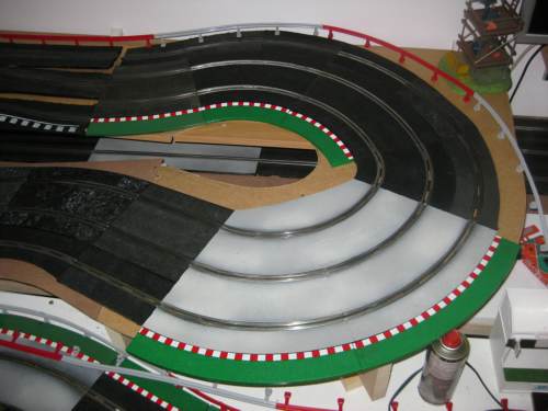 Non, les rails peintes en gris l'avaient été dès le début comme test de faisabilité. Maintenant que la piste est finie, je vais finir de concevoir les bordures et puis, petit à petit je vais redémonter et peindre l'ensemble de la piste en gris. Tout cela se fera en parallèle avec le décor.