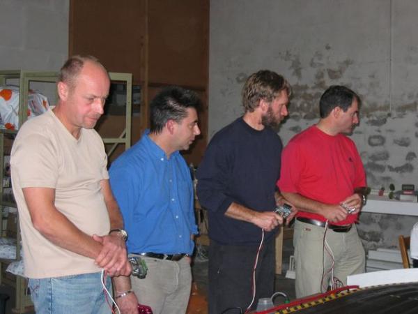 et toujours , second en partant de la gauche , Fred le président qui semble trouver un malin plaisir à se tirlipoter le schmilblick en tapant 7.5 au tour avec sa Toyota Ninco ........comme quoi des fois on s'demande ou ça va se nicher hein ????