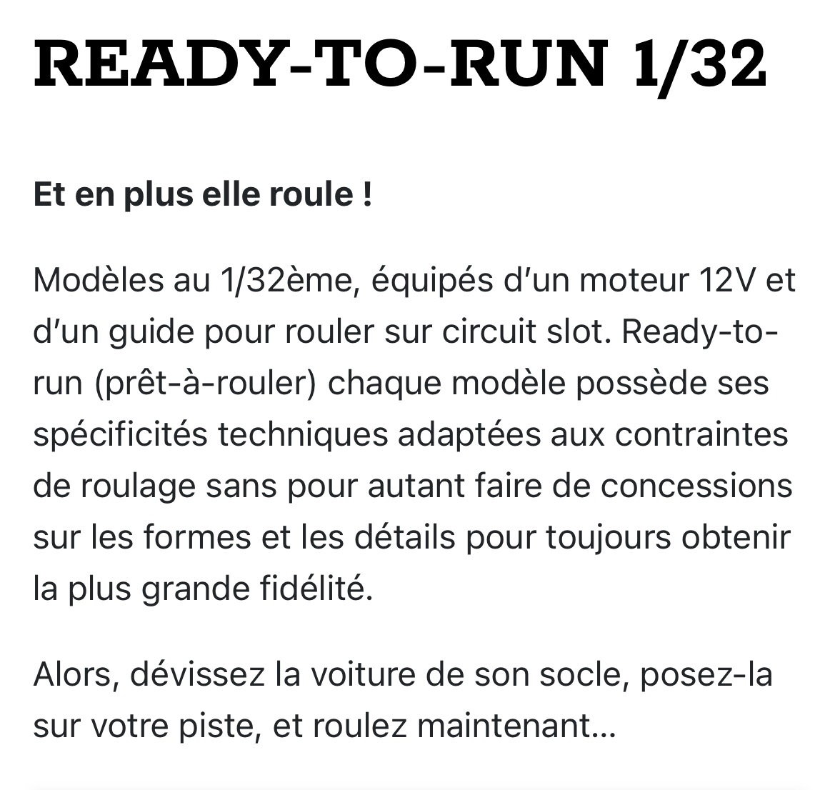Je l'ai déjà dit sur le forum, je ne sais plus où ni quand. Achat d'une Renault Alpine du Mans. Une fois et pas deux. Cela date de plus de dix ans. Jolie mais fragile et inroulable. Couronne mangée en moins de trois tours. Dans sa boîte dans une boîte et plus jamais sortie. J'achète les personnages au 32 c'est tout. Désolé pour le fabricant.