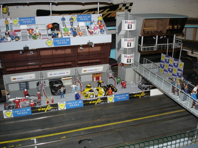 pour exemple, parce que je travail sans plan, voici une photo, moi c'est en adaptant à la place disponible sur mon circuit que je réalise mes "décors", ils sont fixés sur des planche de MDM de 10mm et sont amovibles pour être soit changés ou rebricolés sans être pliés en deux sur le circuit du Nickel