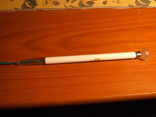 Alors je perce le stylo en haut (trou de la même taille que le culot de l'ampoule), j'enlève la mine, je passe les fils dedans