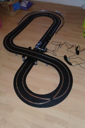 Je précise que ce circuit n'est que temporaire. Un plus grand sera installé à demeure dans une pièce. Il était donc important de trouver la bonne marque, définitivement. Ayant peu de place, j'ai rapidement exclu Carrera. les rails sont trop grandes et peut-être aussi un peu trop "propriétaire" de leur système. Mais là, je suis moins sûr de moi.