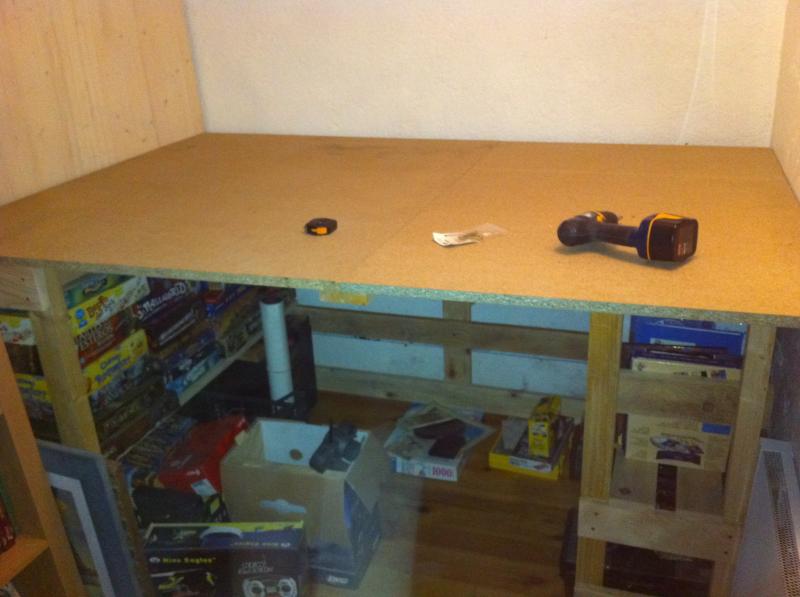 Prévoyez du solide pour la table. Quelle soit susceptible de soutenir du poids et que ca soit costaud. Je fait également remarquer que ce projet pour l'instant m'a couté 22 euros. Le prix de la plaque de gauche et de quelques vis. Le reste c'est de la récup de travaux antérieurs dans la maison. Comme quoi on est pas obligé de se ruiner. Bon, demain mise en place de pistes de test, d'essais, pour s'amuser puisque je n'ai pas encore l'ensemble des rails de la piste dessinée par Brett..puis j'ai pas la PB6.
