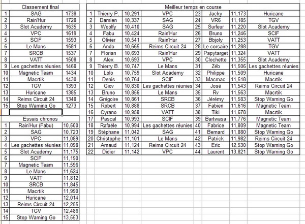 voir le reportage içi et pour cause, durant les trois premières heures on changeaient de voie qu'une fois tous les quatre tours et avec un guide qui comptait les tours tous les ???????? tours (guide clipsé slot it neuf! c'est steph qui nous la vendu il avait peur qu'on leur foute la pâté )plus puce changé trois fois! Enfin la totale!!( je remercie spécialement DRT et 6 CO T qui ont trouvé le problème pendant le temps du casse-croûte) Alors se qui serait bien c'est d'avoir le nombre de tours durant les trois premières heures et les trois dernières pour nous évidemment se serait mieux mais cela fait partie de la course!Quant à vous il était temps que cela se termine car titine avait l'aire de faire la gueule? Quant a toi Bart c'est un réel plaisir de te voir car tu es toujours de bonne humeur et de nos jours c'est de plus en plus rare! Auteur Message bob_cramer Lord of the ring