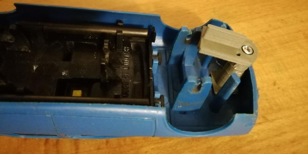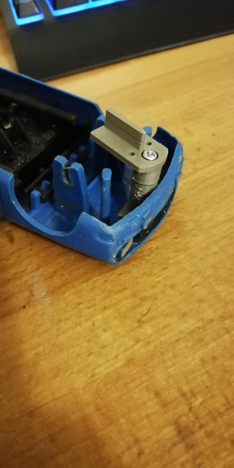 La R12 n'avait plus de guide à l'avant, enfin si, on en avait bricolé un en bois qui faisait le job. Imprimante 3D aidant, je lui en ai refait un.