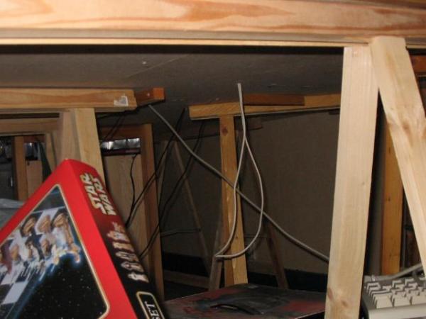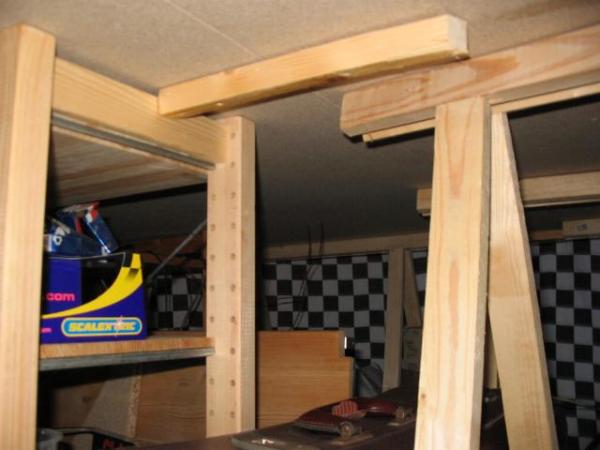 Sur un de mes circuits (voir mon site : http://slotmania.site.voila.fr/ ) des tasseaux en 40 x 40 mm chevillés puis visés au mur supportent le plateau constitué de plaques d'agglo en 16 mm, sur la bordure un autre tasseau visée recouvert d'une plinthe...