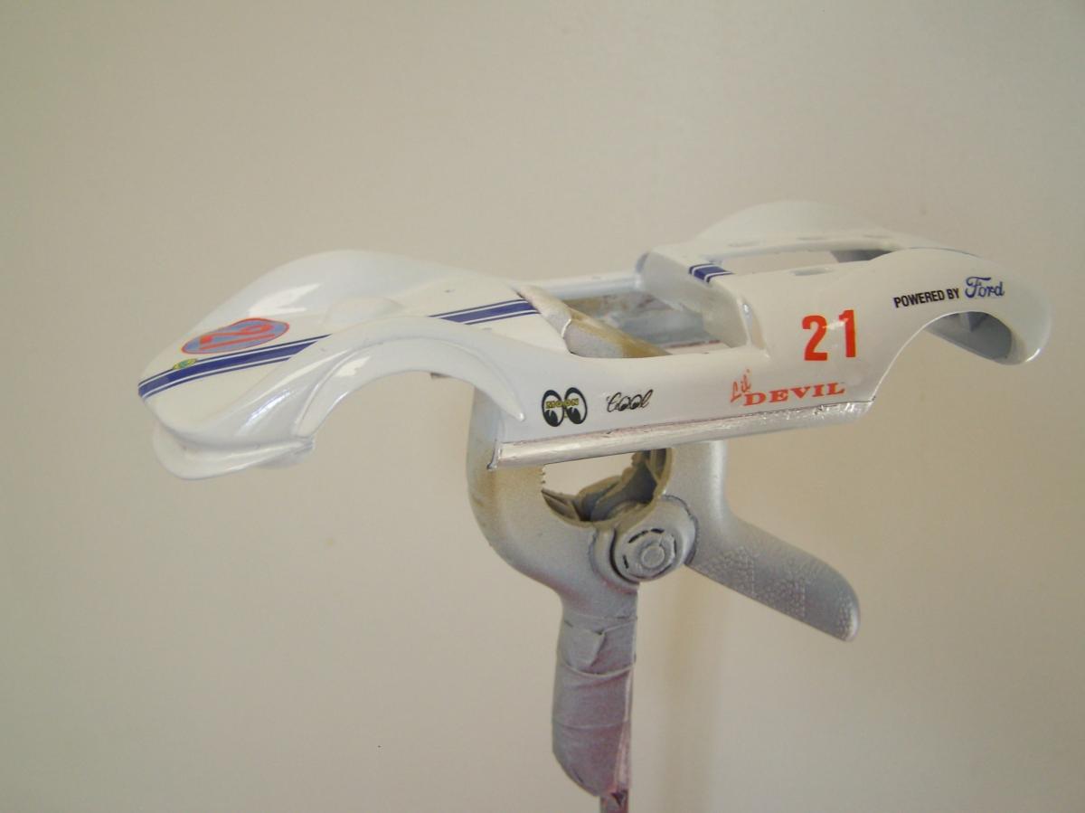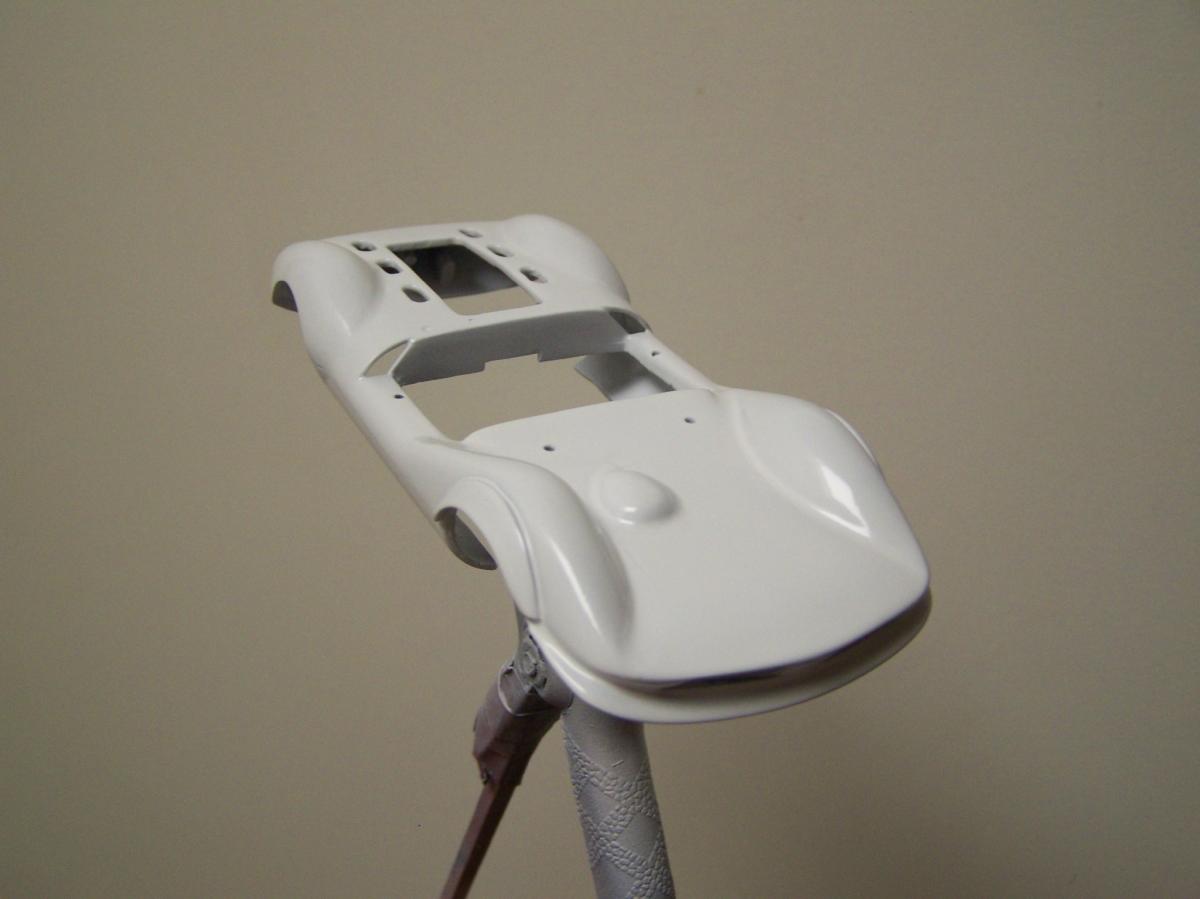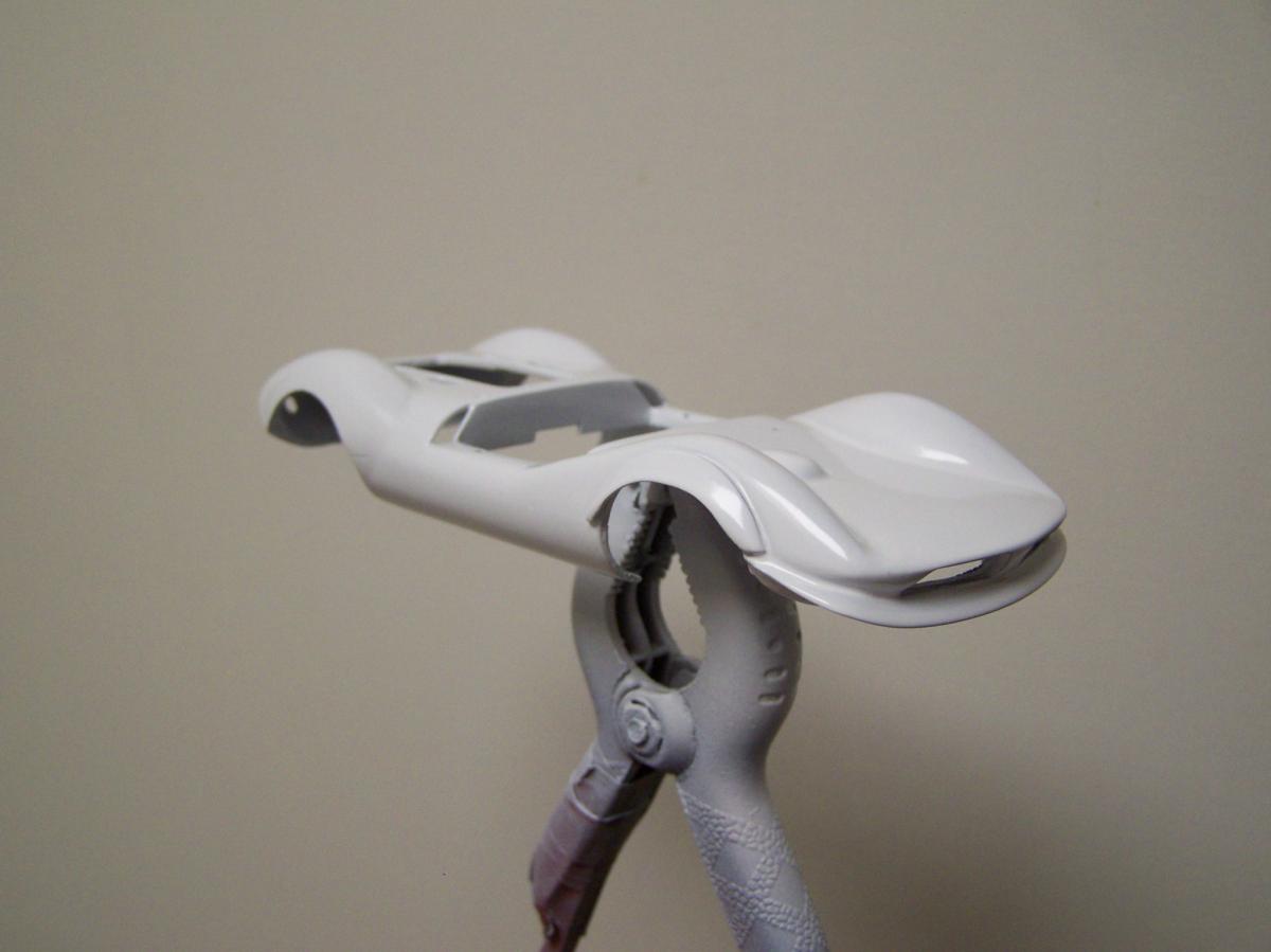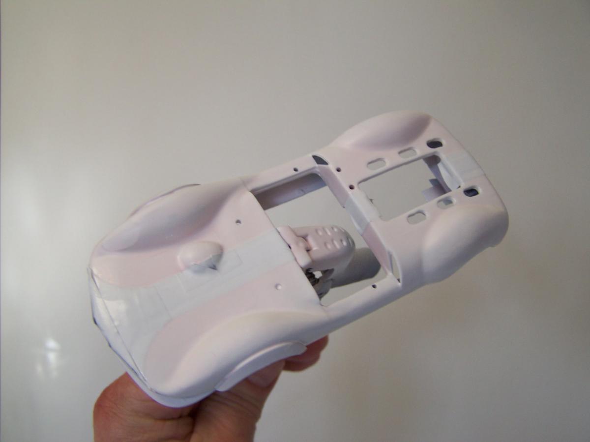 Seulement voilà, après quatre couches de blanc ; deux d'apprêt blanc Totip, une de blanc brillant Totip et une de blanc satin Tamiya au pinceau, le rouge transpire toujours donnant à la voiture une teinte rosée, comme visible sur la photo ci-dessus. Et c'est encore pire en vrai ! Il semble que malgré les 48 heures de séchage, la peinture rouge se re-dilue à chaque fois que je passe une nouvelle couche, pour venir se mélanger à la teinte. Rien à faire, j'ai beau empiler les couches le rose est toujours là. De plus, à force d'empiler les couches de peinture la voiture commence à ressembler à une savonnette ou une dragée.