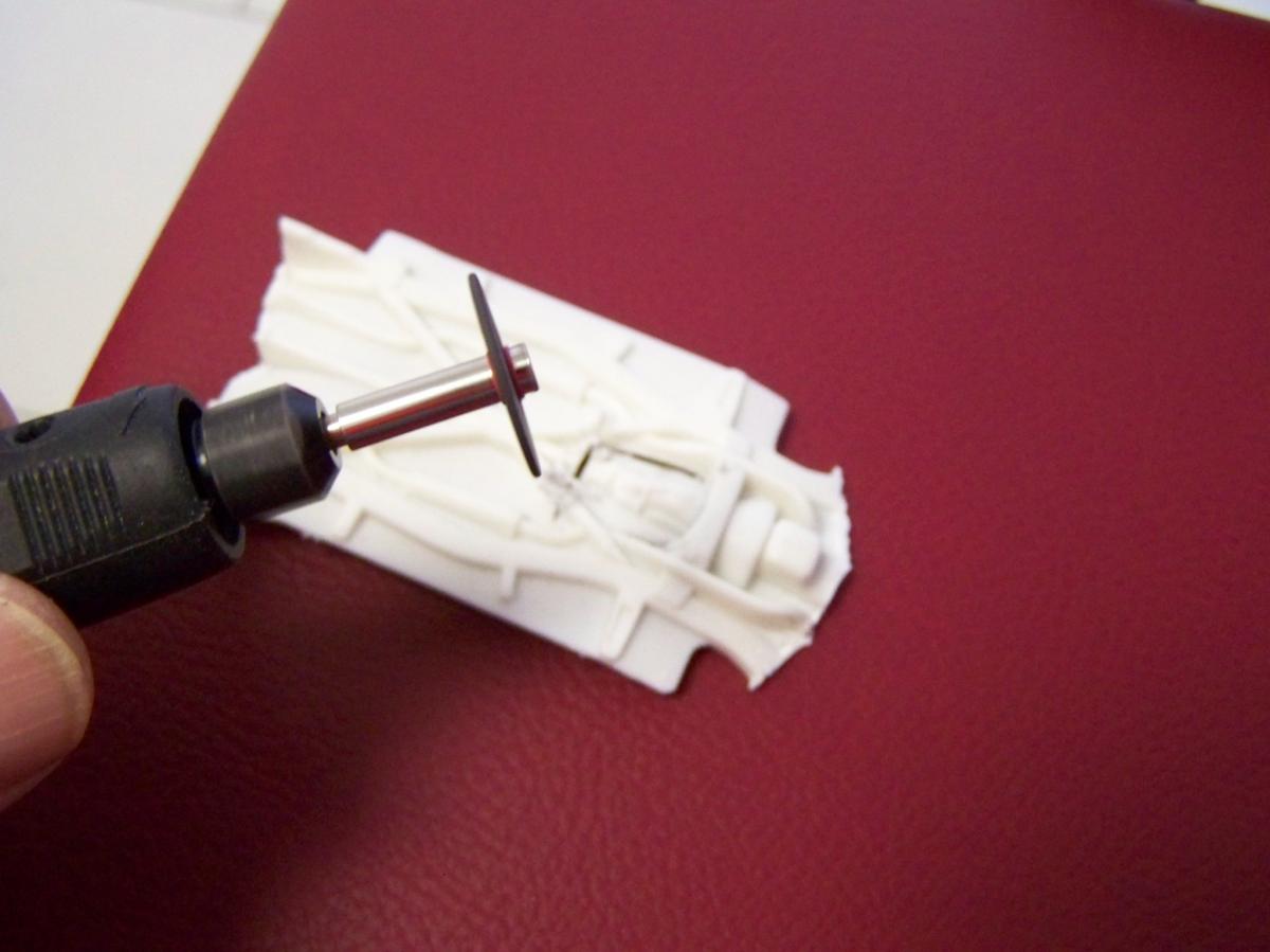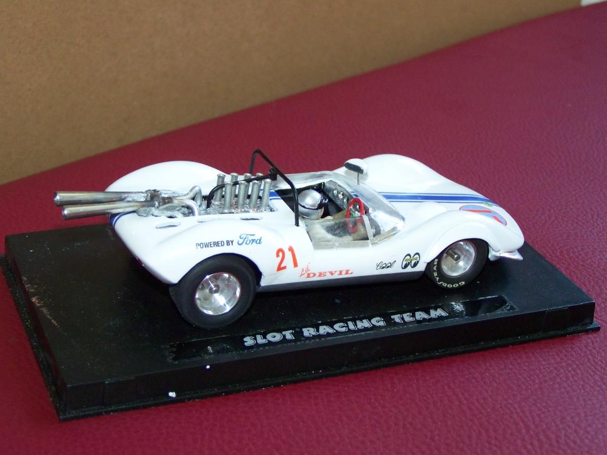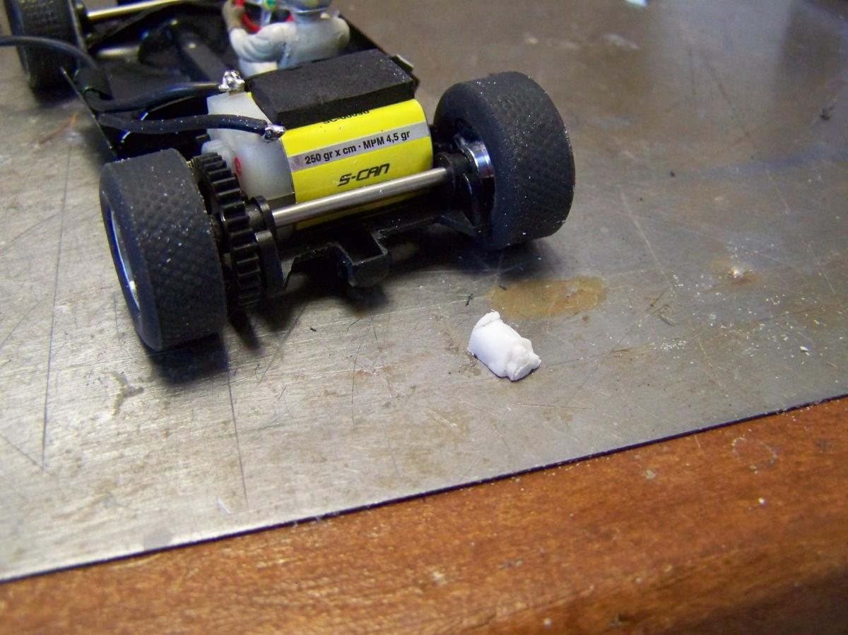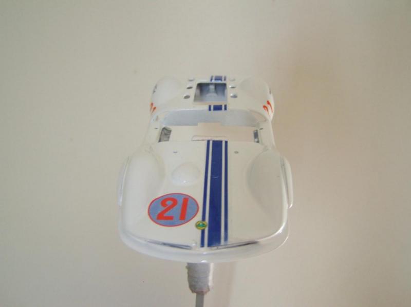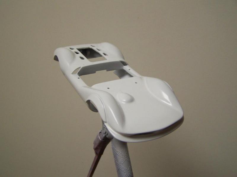 Seulement voilà, après quatre couches de blanc ; deux d'apprêt blanc Totip, une de blanc brillant Totip et une de blanc satin Tamiya au pinceau, le rouge transpire toujours donnant à la voiture une teinte rosée, comme visible sur la photo ci-dessus. Et c'est encore pire en vrai ! Il semble que malgré les 48 heures de séchage, la peinture rouge se re-dilue à chaque fois que je passe une nouvelle couche, pour venir se mélanger à la teinte. Rien à faire, j'ai beau empiler les couches le rose est toujours là. De plus, à force d'empiler les couches de peinture la voiture commence à ressembler à une savonnette ou une dragée.