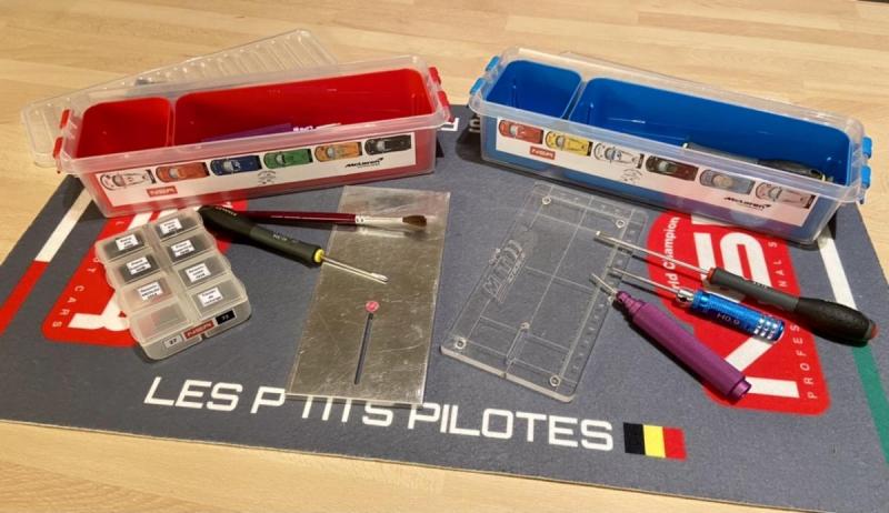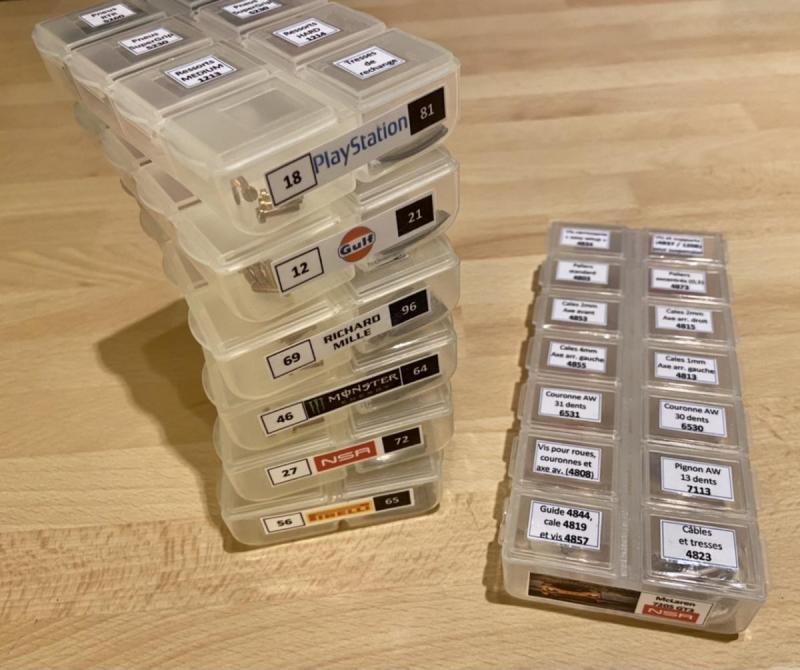 J'ai également préparé les petites boîtes avec les pièces de rechange de chaque équipe (pneus, vis, paliers, ressorts etc.). Tout est répertorié et étiqueté.