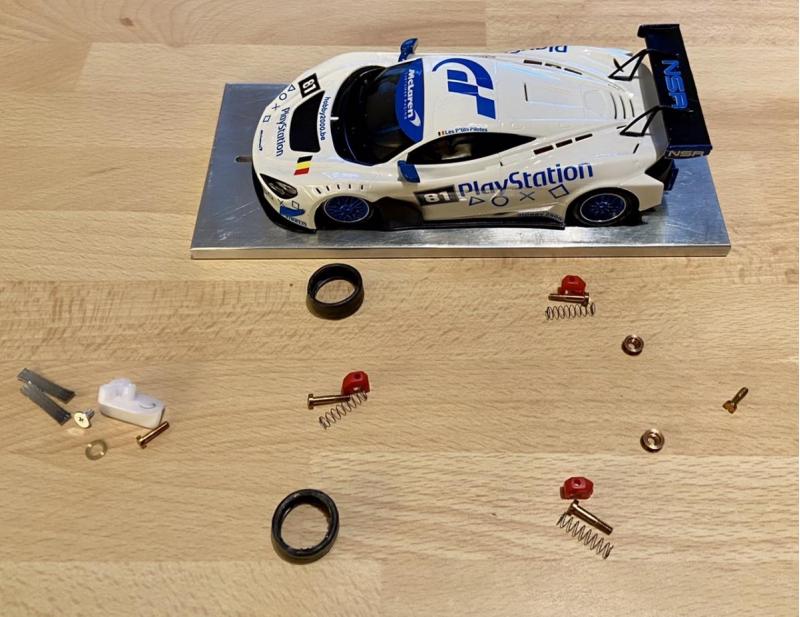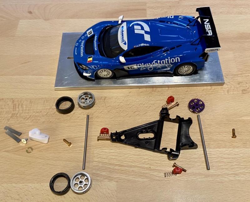 Petite parenthèse: je me suis amusé à peser les voitures avant et après transformation de la partie mécanique, et le châssis séparément de la carrosserie. Quelques différences de masse peuvent être observées d'une voiture à l'autre: elles sont faibles et de façon assez amusante une partie de ces différences s'explique par le nombre de couches de peinture utilisées! Par exemple, la PlayStation bleue et la Richard Mille noire ont toutes deux été repeintes suite à des changements de décoration décidées en cours de route, et cela se traduit dans les masses de leurs carrosseries - c'est de l'ordre du demi-gramme, ceci dit …