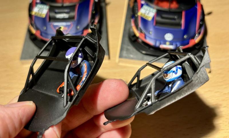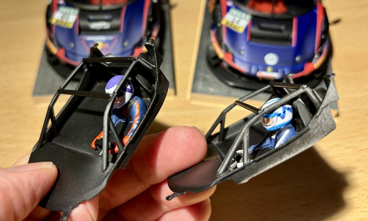 Une autre différence entre les kits est le cockpit, que je prends souvent plaisir à décorer le plus fidèlement possible. Celui de la 488 arrive déjà peint et assemblé (y compris la visière du casque), le pilote étant en plastique blanc, ce qui permet de le peindre facilement dans n'importe quelle couleur. Pour la 296, l'ensemble arrive en plastique blanc: il faut donc peindre le tout en noir mat, repeindre le pilote en blanc mat dans la plupart des cas (avant de le peindre dans la couleur finale), peindre le visage du pilote en couleur chair, puis placer la visière.