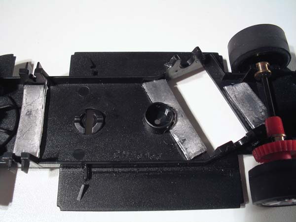 3) avec du plomb fin , tu leste l'avant de la Renault afin que le guide à ressort fasse son boulot et que tes pneus avant servent d'appui en courbe mais pas trop .Dans la mesure du possible leste l'avant par l'extérieur du chassis afin d'abaisser encore mieux ton centre de gravité ( plomb fin )