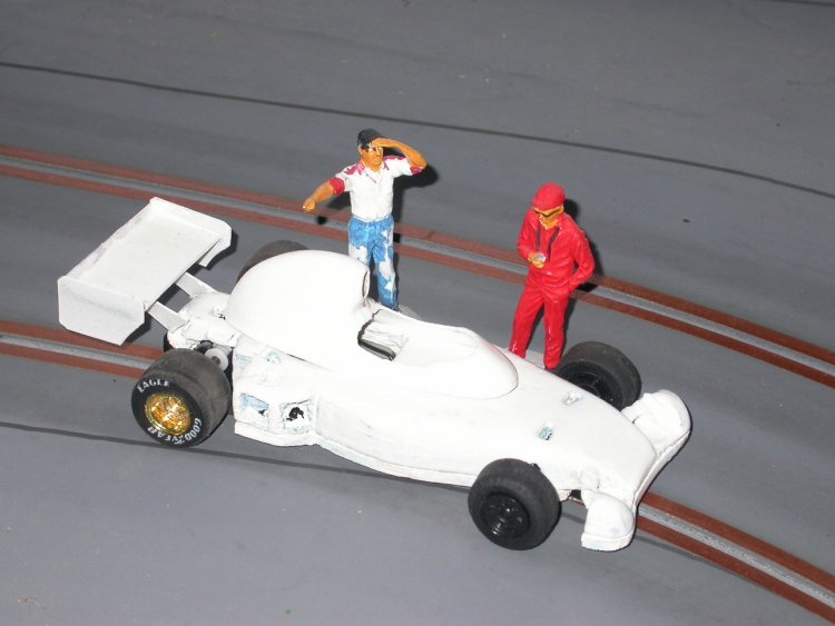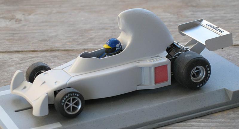 bon après deux essais infructueux au niveau de la carrosserie ( problème de lexan soit trop éepais soit trop fin) je me suis résigné à évider ma forme en bois,je l'ai adapter sur un chassis de veille scalex indy ,reste la peinture , les décals(je sens que je vais encore joyeusement galérer) fabriquer l'aileron ar et un semblant de faux ar moteur , donc encore beaucoup de taf , je vous tient au courant