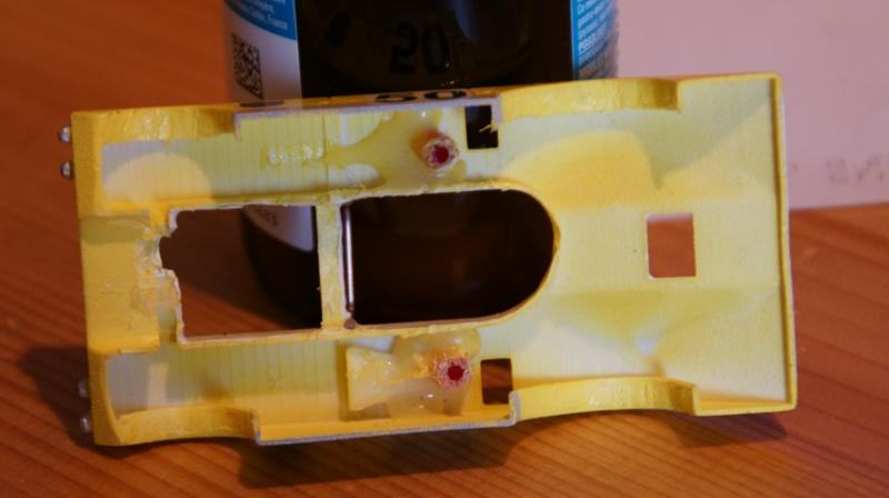 enfin bref, pour la faire courte, le guide touche la piste et les roues avant sont dans le vide, de beaucoup ! impossible de remonter le guide, en effet, il est déjà a raz de la carrosserie ! a cause du nez qui plonge ! .... et j'ai déjà baissé l'axe avant au max ! du coup, j’essaie de me faire un châssis avec le guide juste "derrière" l'axe avant ! j'en profite aussi pour faire quelques bricole a l’arrière, style pièces de moteur ... ça donne ça :