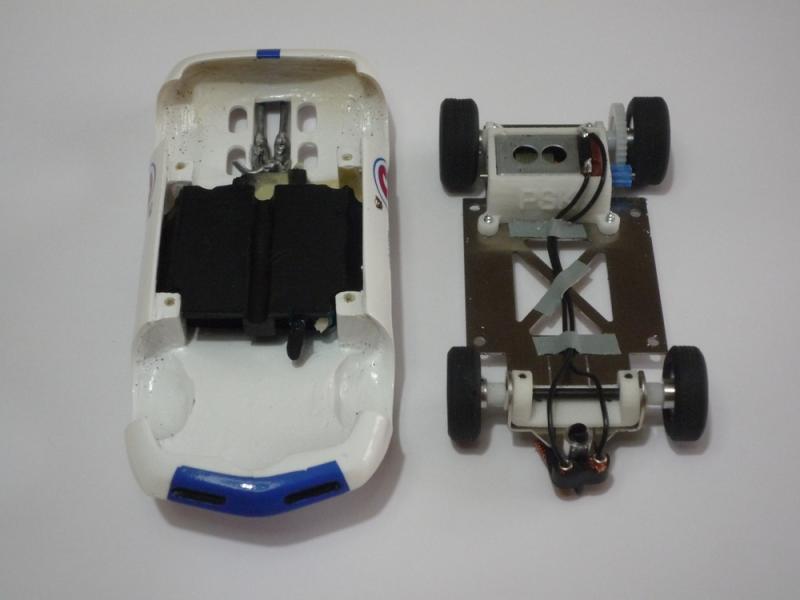 Concernant les dessous de la belle, j'ai monté le châssis PSK KR01 (www.adm-albatros.fr/fr/circuit-routier/echelle-1-32eme/pieces-chassis/psk/chassis-metal-sw-kr01.html). La carrosserie étant prévue pour ce châssis, l'adaptation est facile à condition de soigner le passage des fils électriques. Je mettrai prochainement une photo montrant la petite modification que j'ai faite sous l'habitacle pour me simplifier la vie ...