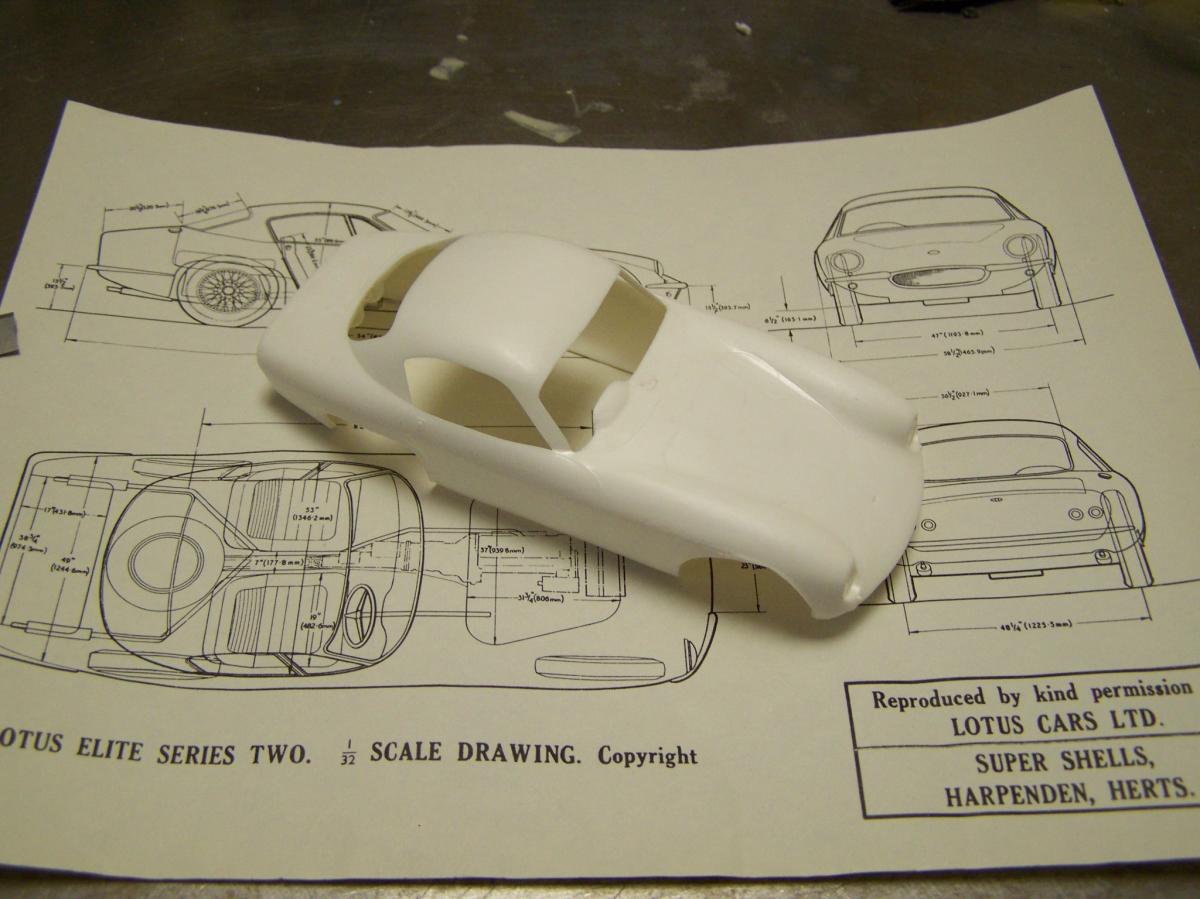 Notez au passage que sur la photo, on aperçoit sous la carrosserie, le plan à l'échelle exacte 1/32, de la vraie Elite.