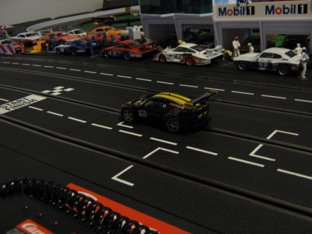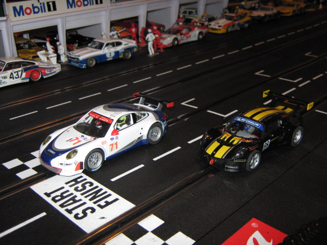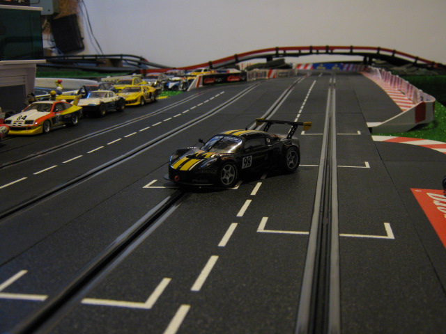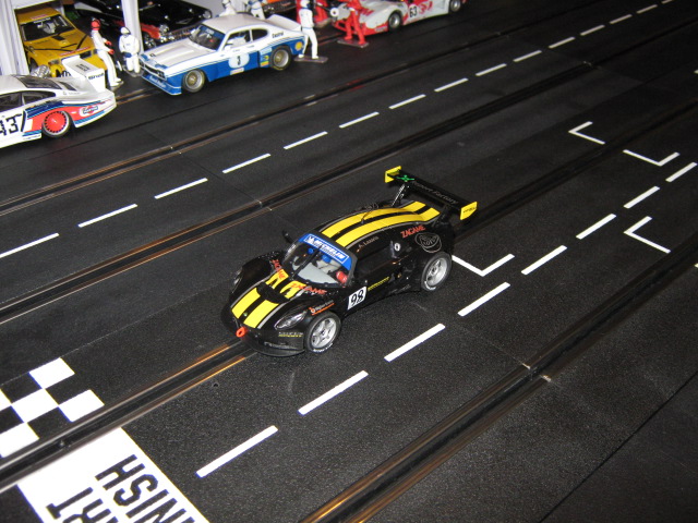 Finalement,j ai réussi a la faire avancer et presque suivre la Porsche..Pour atteindre de hautes vitesses,je dois installer un Universal Guide de Carrera ,il est petit mais plus profond.Heureusement que ca existe pour moi.Il semble aussi que les rails Carrera sont moins denses pour les magnets que les rails Scalex et Ninco(ce que m as dit le vendeur).Je vais vérifier.La Lotus est tres rapide sur le 18 volts Exclusive mais tres bruyante aussi.Ca roule doux mais c est comme si y avait un 'grinder' dedans.La piste de notre club a encore 230 pieds cette année,j ai hate de voir cette voiture en action avec les concurrants.Eh ben...Bonne semaine,ici ,il pleut a boire debout.