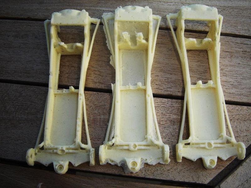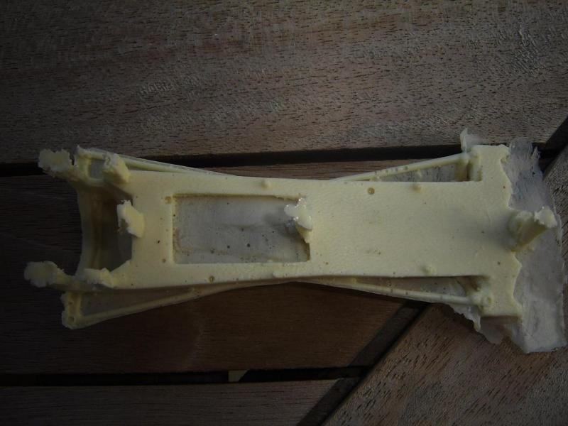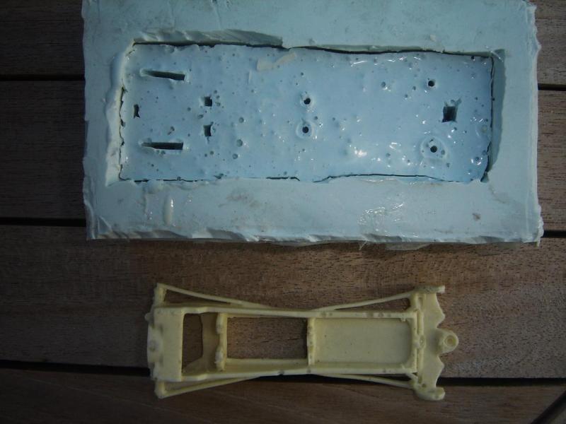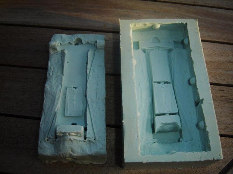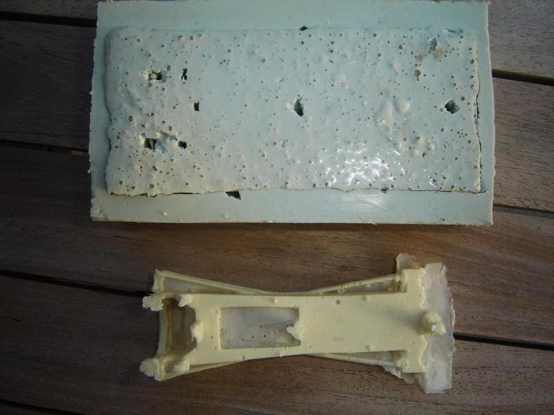 3 - un moule aux ouvertures et trous de coulée judicieusement placés. Il faut garder en tête que l'air remonte toujours et qu'il doit s'échapper du moule vite et bien. dans ton cas, j'aurais fait une carotte de coulée pour remplir le moule déjà fermé et positionné le châssis à la verticale. j'aurais aussi intégré le trou pour la vis dans mon moulage, soit juste en silicone, soit en intégrant un noyau en dur (rond d'acier ou d'alu, ou plus simplement encore, la queue d'un fôret - au démoulage, une petite rotation du fôrer à la pince et clac, il se détache de la pièce. y'a plus qu'à le tirer du moule pour pouvoir démouler).