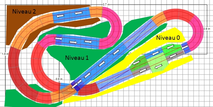 En fait, je verrais bien - à terme, bien sûr! - ton circuit avec trois niveaux principaux de relief, en escaliers, comme ceci: