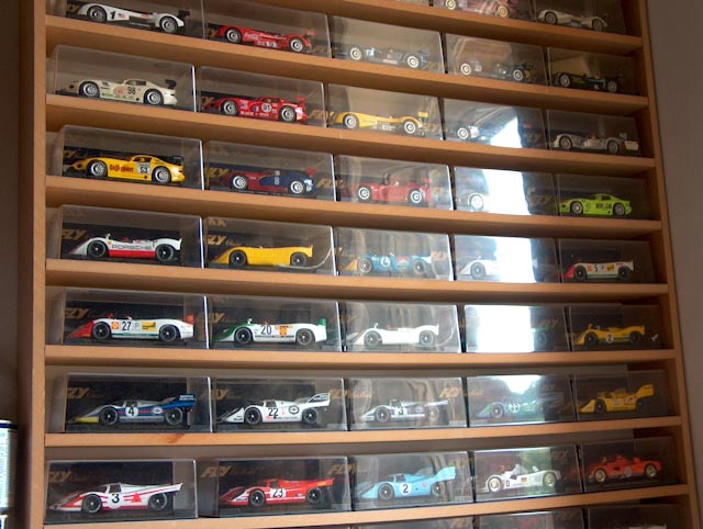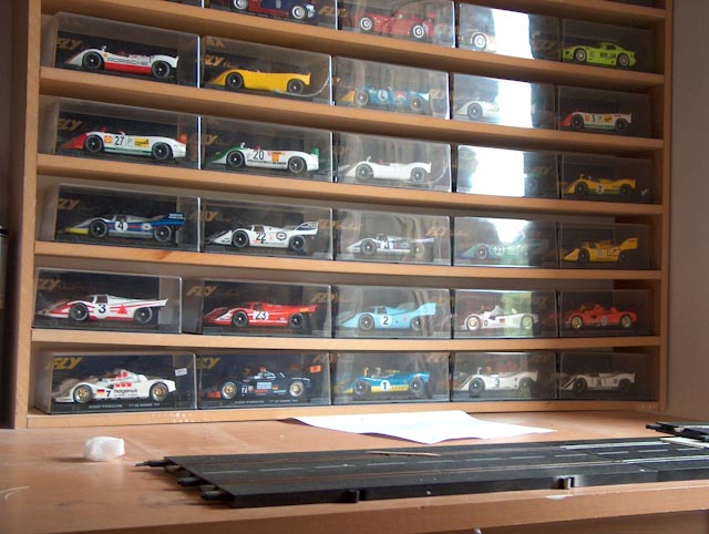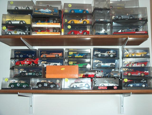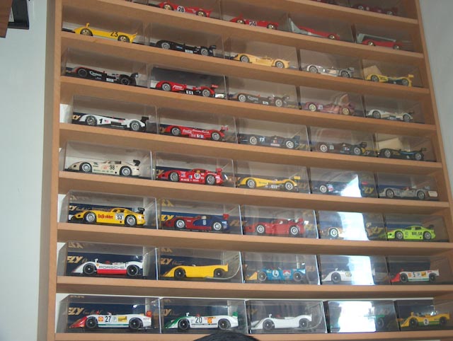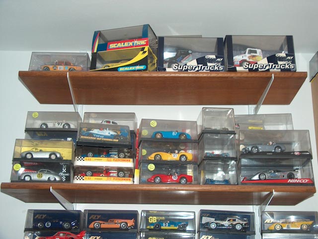 oui c'est des fleischmann des ferraris ,en fleischmann j'en ai une dizaine ,mettrais des photos après. pour le meuble c'est moi qui l'ai fait avec du medium. sur le meubles c'est toutes des fly . sur l'étagère ninco ,slot it, fleischmann, gb track, et scalextric. et il me reste encore une vitrine avec des vieilles scalex et autres.