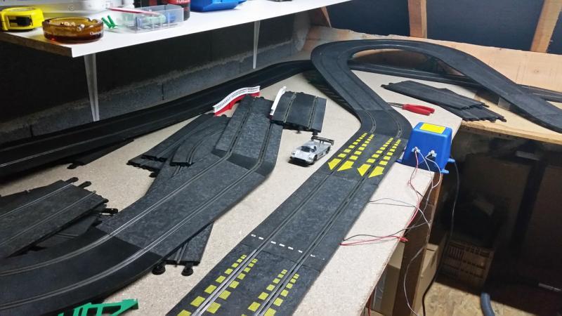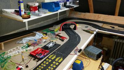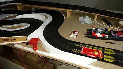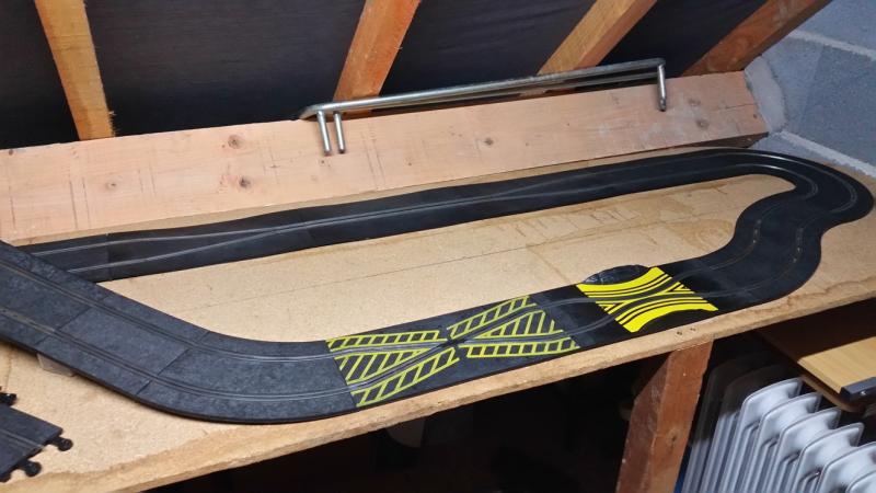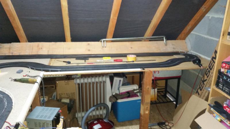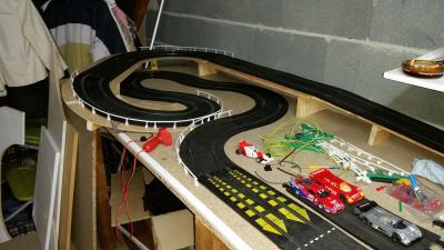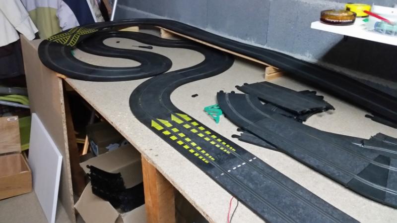 je viens de finir mon amenagement dans mon garage. j'ai fixé un plateau en L de 3.55m / 95cm et le retour de 1.40m/70cm il me reste plus qu'a imaginer une piste . je vous fais des photos demain. Yesss c'est bon ça .