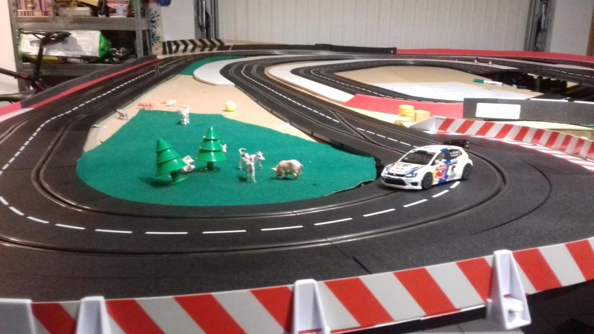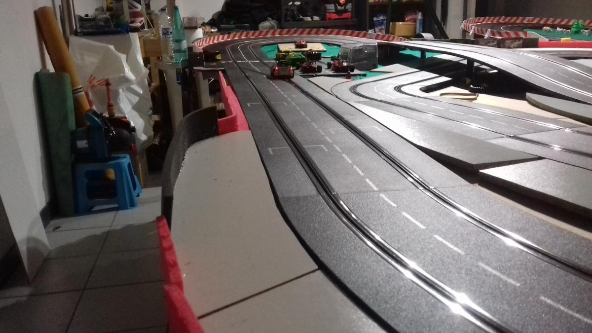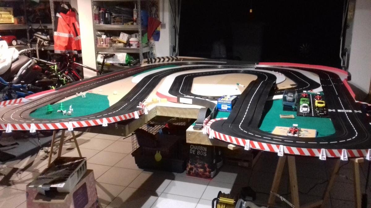 Voici ma piste , elle est posée sur un plateau de 2m90 × 2m40 avec une découpe pour s insérer autour de l éclairage du garage puisqu'il remonte au plafond. J aimerais connaître l avis des spécialistes qui fréquentent cet excellent forum.