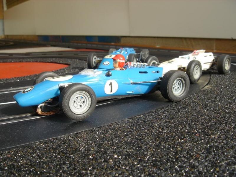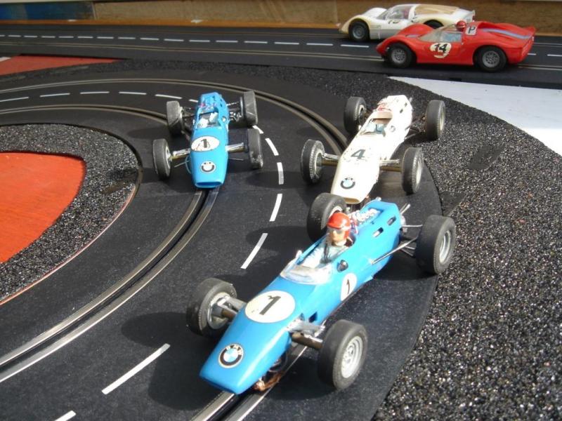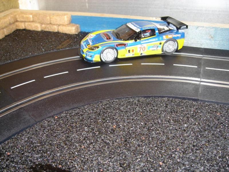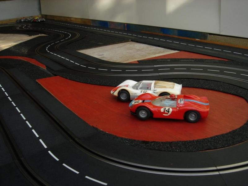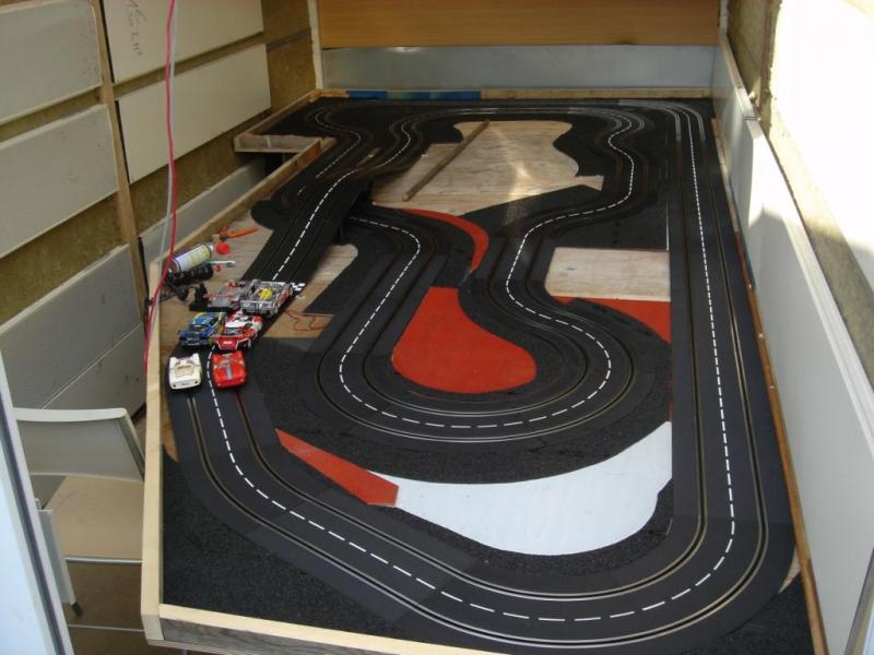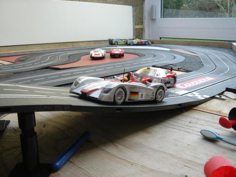 Voici quelques vues de mon circuit. Je ne pensais pas un jour pouvoir réutiliser ces anciens rails carrera qui on plus de 35 ans. Mis à part le grip légèrement différent des rails actuels, ils sont parfaitement compatible avec les actuels rails carrera. J'ai ajouté au circuit un pont surélevé et une grille de départ neuve.