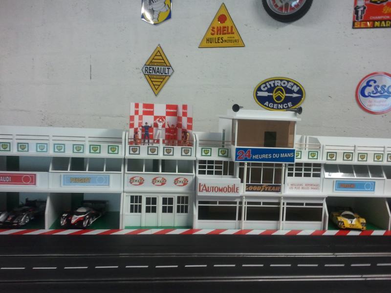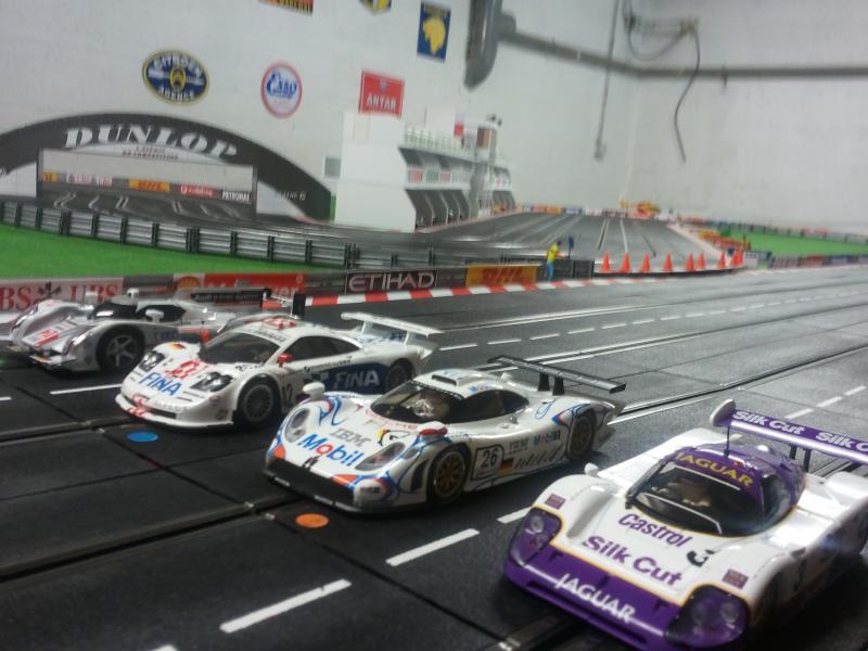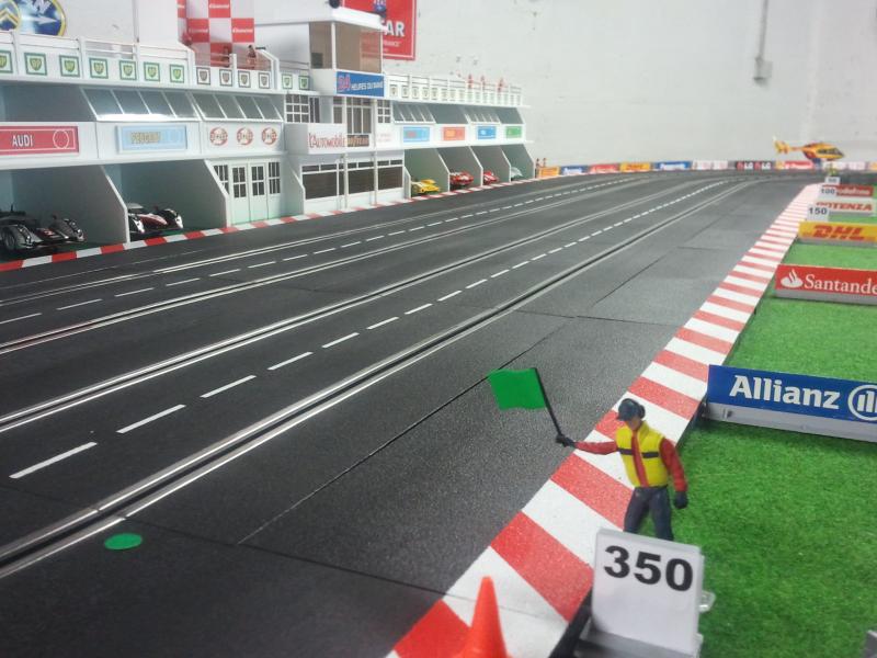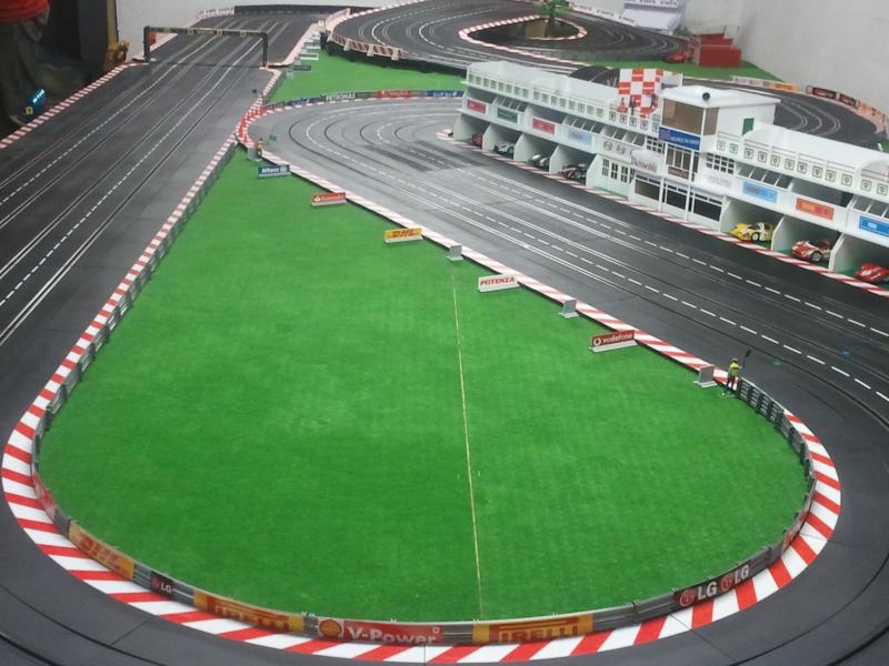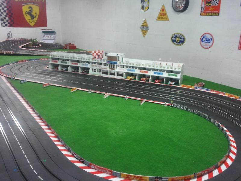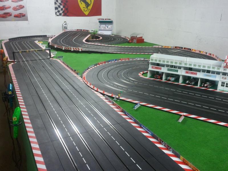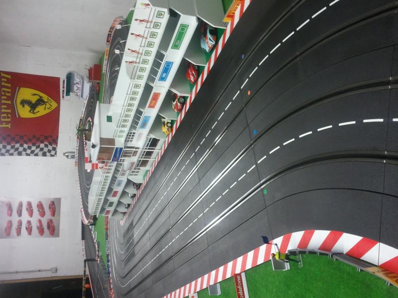 Merci les enfants pour ces premières retombées, cela fait plaisir! Mes impressions pour le roulage: la piste est assez rapide. J'ai réussi à tourner en moins de 6 secondes avec une Mosler Nsr sans aimant bien sûr. Mon plateau mesure 6,75m sur 2,50m. La grande ligne droite est constituée de 14 rails droits (4,90m). Pour le développé, je dirai au pif à peu près 25m. C'est un tracé que j'ai copié sur le net et fait à la louche! J'essaierai avec l'aide de ma douce moitié de vous envoyer d'autres photos ces prochains jours. Je dois apporter quelques petites modifications: la descente de l'escargot est un peu trop pentue. Bonne soirée à tous!