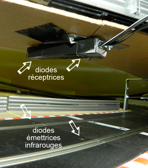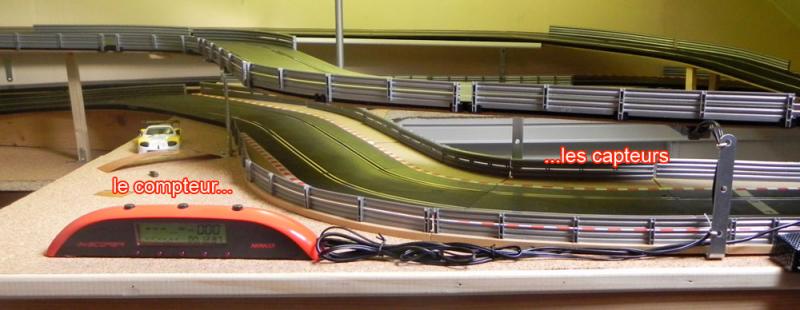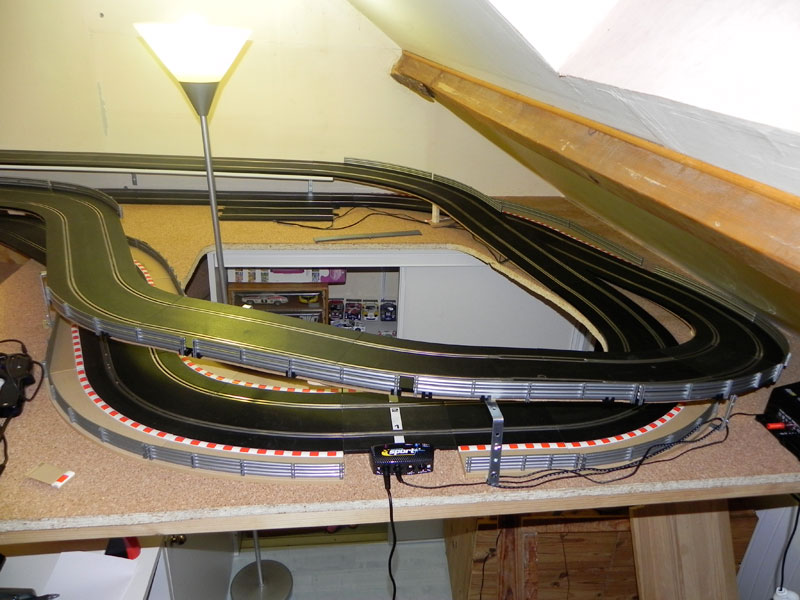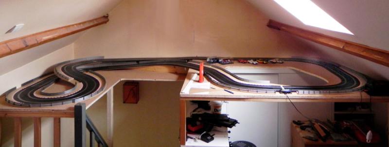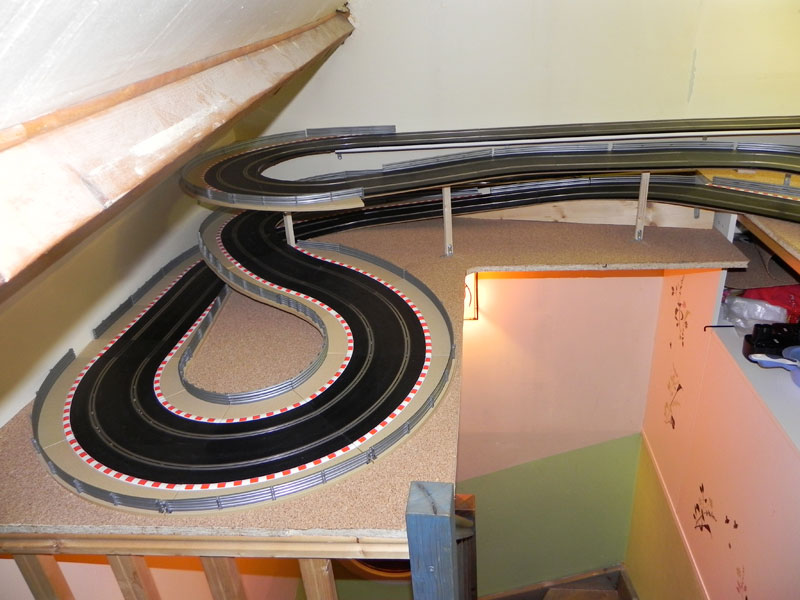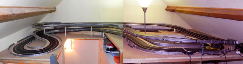 Gilou :Le trou a droite permet d' aller ramasser les voitures au fond, car mon bras ne fait pas un 1m50 et comme le plateau de droite est a 1m23 de haut, il est facile de passer dessous . Il n y a qu'une seule piste , le changement de niveau se fait sous la sous-pente de droite.