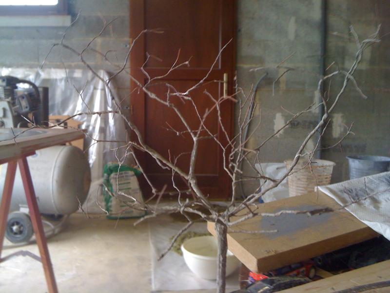 les arbres son fais avec du fil de cuivre que je torsade pour obtenir une forme d arbre apres je les étame sur toute la structure de l arbre puis peinture maron et voila